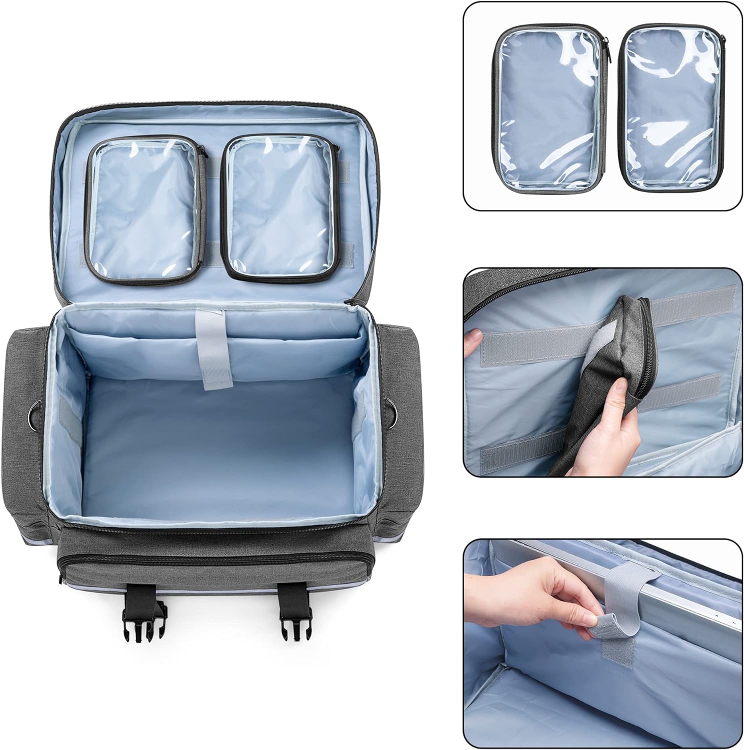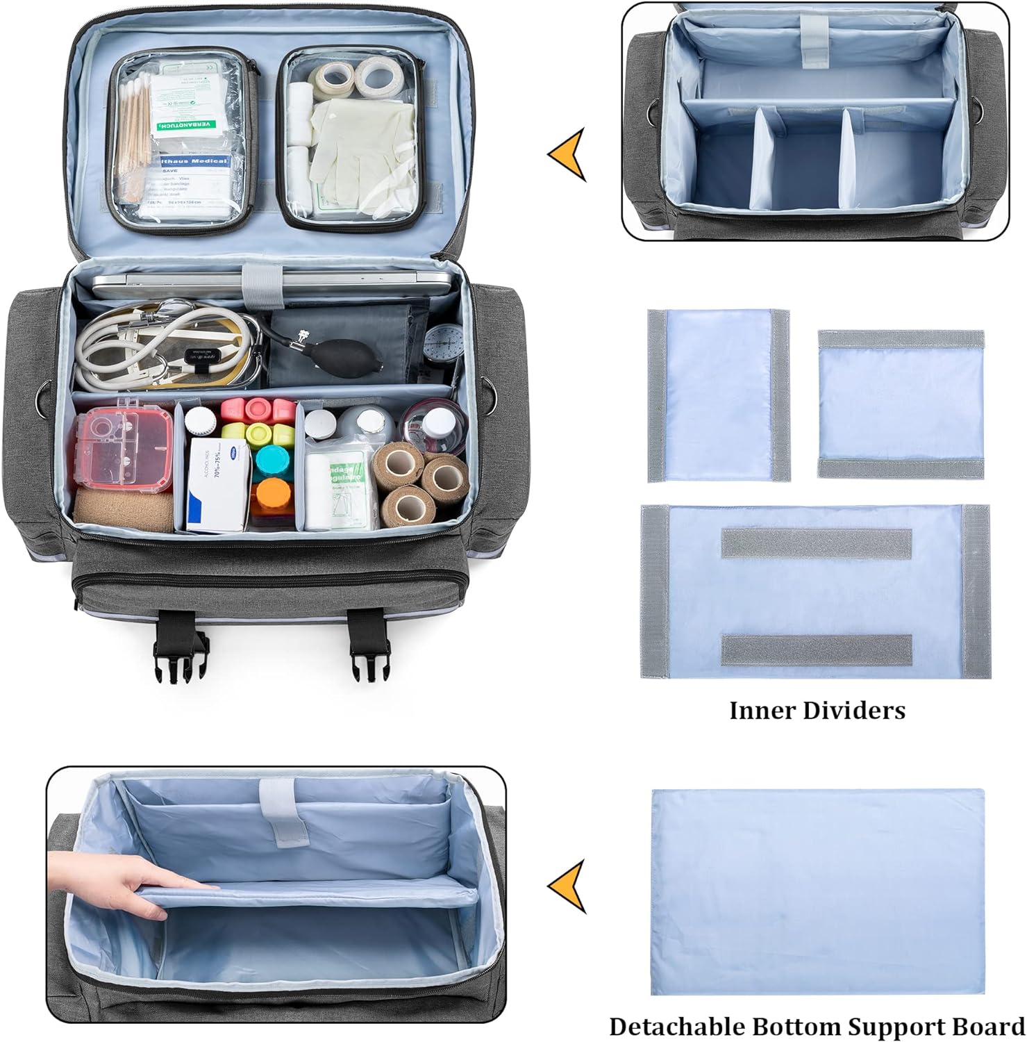 LARGE CAPACITY: Main compartment equipped with 3 detachable dividers, which could be customized according to needs. 2 Transparent small pouches for quick access items. The front compartment has 2 zipper pockets and multiple elastic bands for medical equipment. 2 Side pouches add extra space.