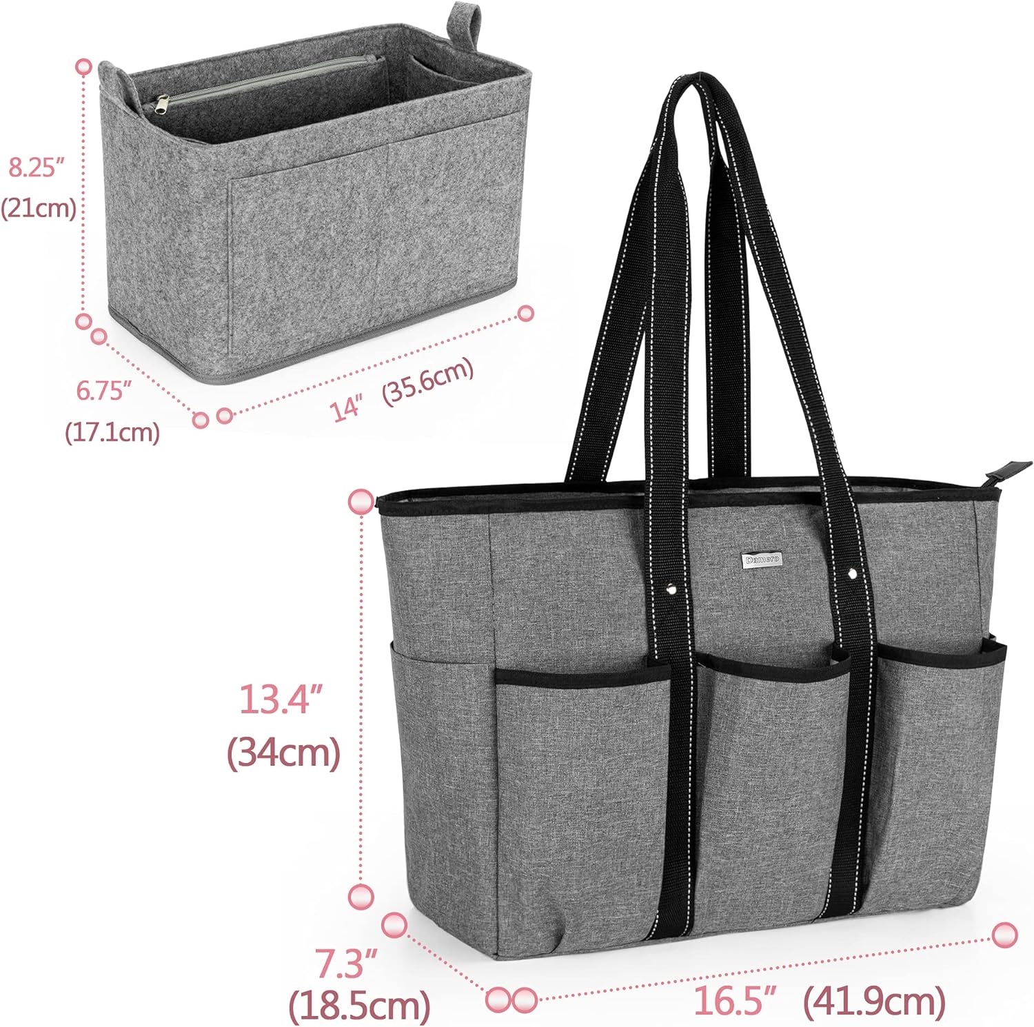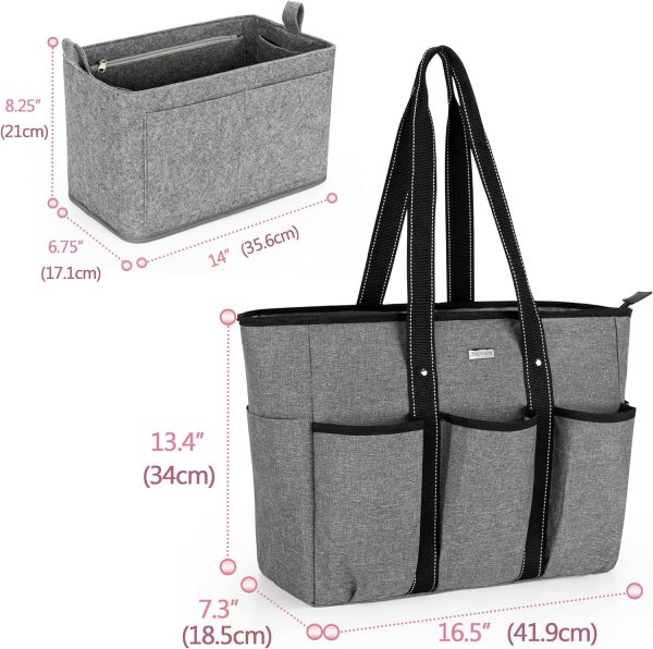 HIGH QUALITY: Teacher Tote: 16.5’’ x 7.3’’ x 13.4’’; Insert Bag: 14” x 6.75” x 8.25”. This teacher utility tote bag is made of durable, lightweight fabric. Padded cushion around the bag offers great protection for your stuffs. The handles are long enough to actually carry on your shoulder.