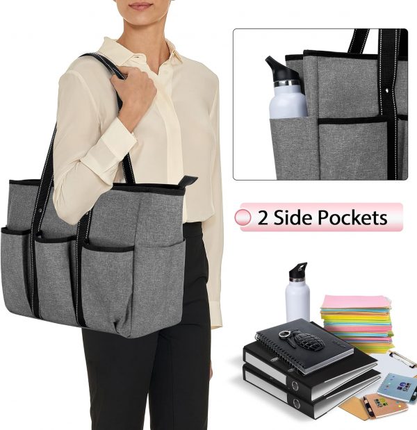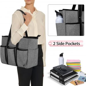 TEACHER TOTE BAG: 6 Exterior pockets in front and back for pens, marker, small notebooks, etc.. 2 side pockets for water bottles, umbrella etc.. The zip- top design keeps the bag safe and in case of bad weather.