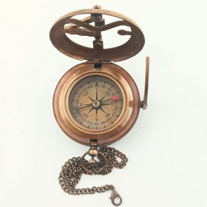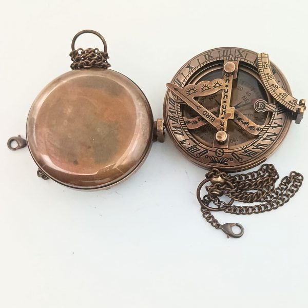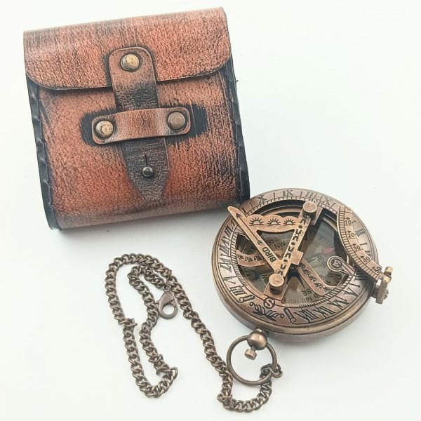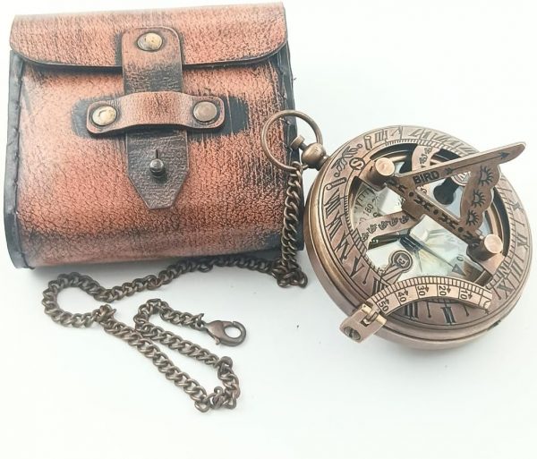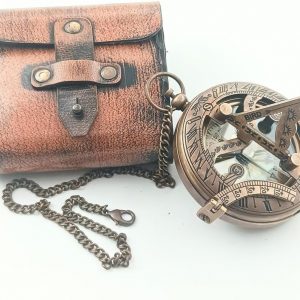 Collectibles Nautical 3″ Push button sundial compass in antique finish with leather case. The chain shown with lock is also included. A free brass keyring is sent along as a gift. It would surely make a great gift for a maritime, nautical and outdoor enthusiast. A great collection for steampunk collector. Also a unique gift for men who has everything. The steampunk clock is also great for antique décor. The vintage compass makes great wedding anniversary gifts for him. If you are looking a unique anniversary gift for men, this is the one. Material : Brass, Leather Finish : Antiquated Brass Diameter : 3 Inches approx. The compass as well as the sundial are functional. It can be used for basic measurements. Handmade, not sold as antique. Made in India by highly skilled craftsmen.