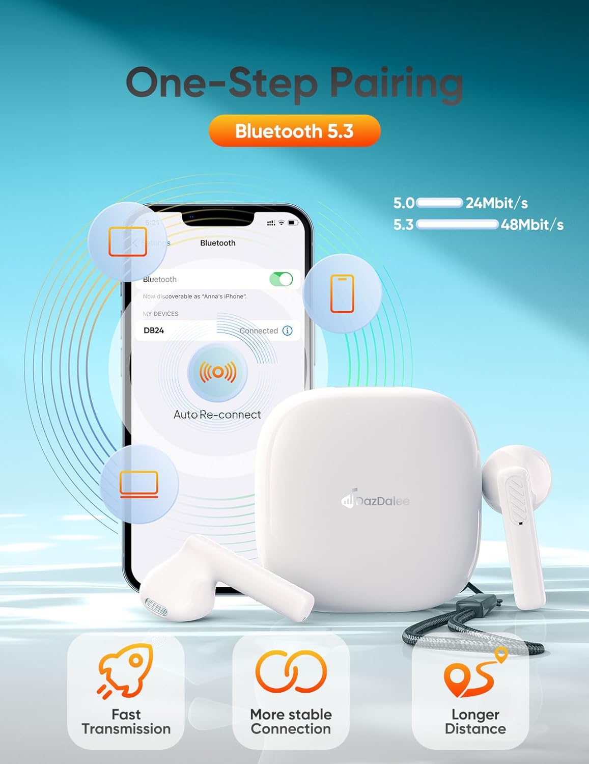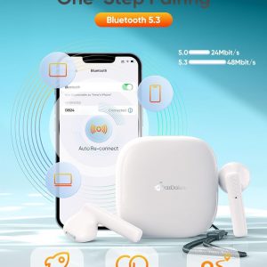 👂【Bluetooth 5.3 & Auto Quick Pairing】: The advanced Bluetooth 5.3 technology provides a faster, more stable connection for the headset, syncs audio and video without latency, and is broadly compatible with iOS/Android/Windows systems. This wireless earbuds has a built-in hall effect switch, after the first successful connection, you only need to open the charging case lid, the bluetooth headphones will automatically power on and connect with your phone, the range can reach up to 100ft away.