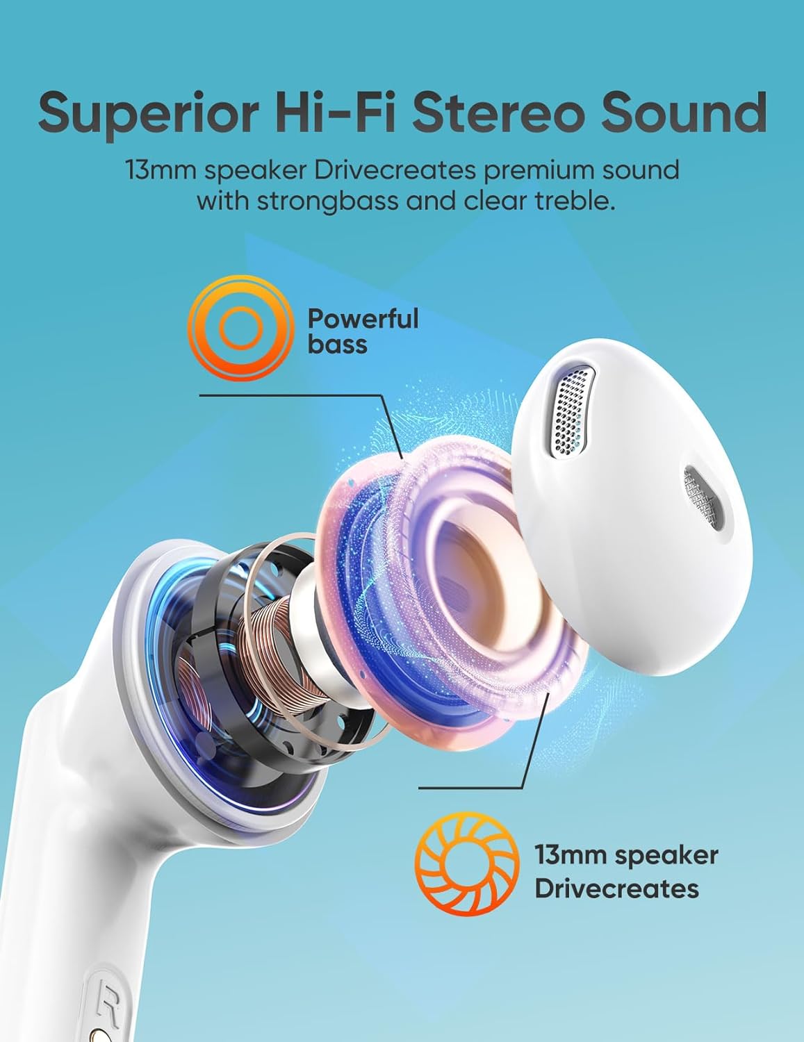 The powerful 13mm speaker delivers sound with deep bass,stunning treble and clear mid.