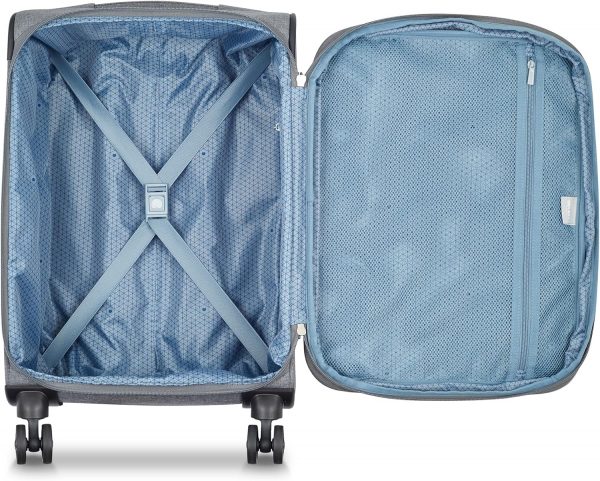 Interior includes tie down straps to ensure your wardrobe stays put while you travel, and a zipped mesh pocket for organization