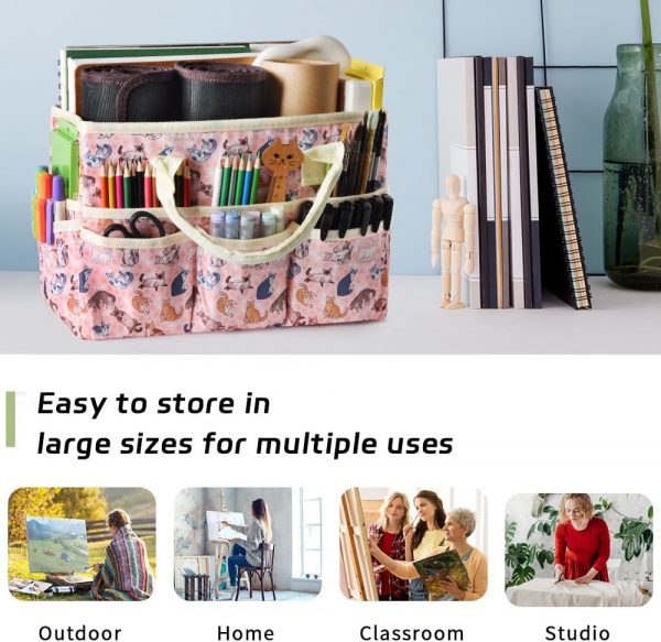 2 reinforced portable handle makes this multipurpose art bag convenient to carry everywhere.The open pockets give you quick access to frequently used items.It folds flat to take up minimal space when not needed.