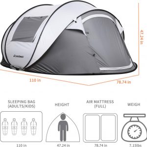 ⛺【SPACE】 This instant tent has a spacious room (110” x78.74″ x 47.24″) which can fit 4 sleeping bags/pads. It is a good idea to be used as a family camping tent for family trip. Center Height:47.24″.