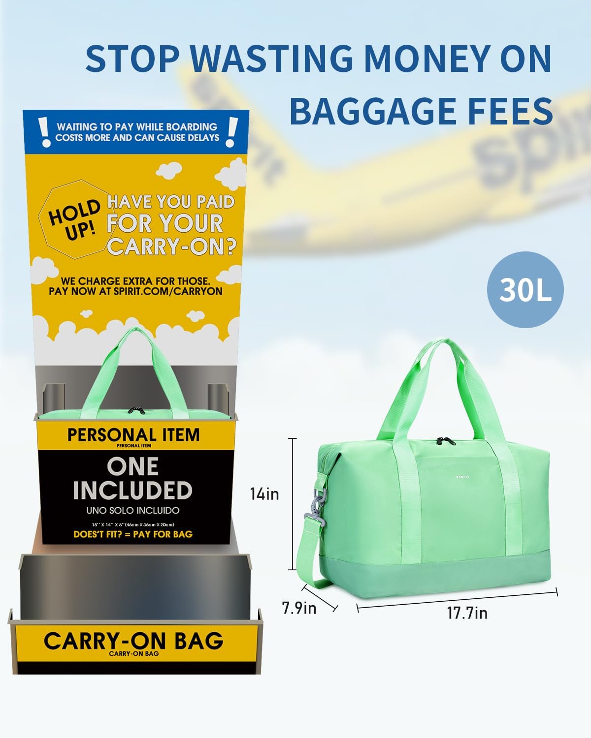 【AVOIDING CHECKED BAG FEES】: The underseat carry on bag measures 17.7 x 14 x 7.9 inch. Using our personal item travel bag, you can dodge those annoying fees altogether, saving you a bunch of cash every time you fly. Suitable for all major airlines like spirit, frontier, easyjet.(PATENT PENDING) NOTE: Please make sure not to pack your personal item bag completely full (aim for under 90%) to pass the tester