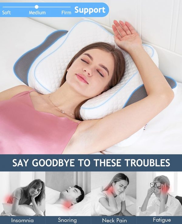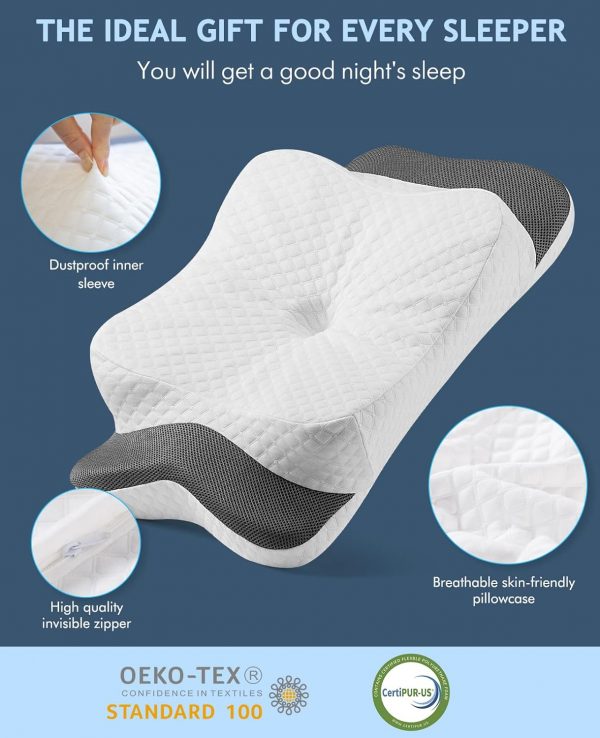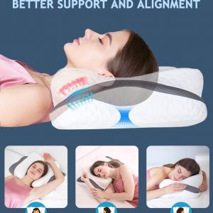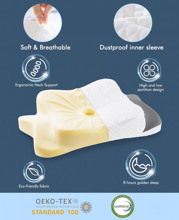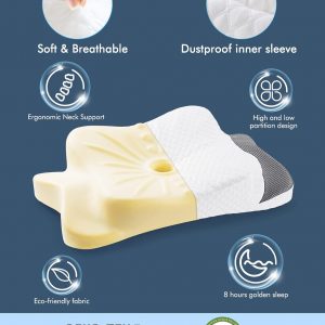 Ergonomic Design: The shape of cervical neck pillow adopts a unique butterfly patent contour design, which perfectly fits the physiological structure of the human head and neck. The cervical support pillow is designed with four functional areas: cervical support area, hollow low support area(head support area), side sleeping support area and arm support area. It has a taller profile compared to the normal square profile option, that fits your body’s natural curves well for a restful night’s sleep and less snoring.