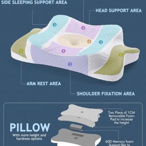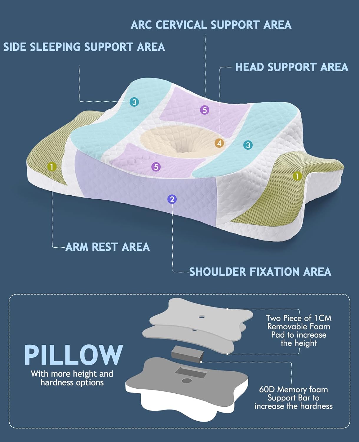 Versatility Pillow: The neck support area keeps your neck aligned to prevent unnecessary stress that can lead to neck pain; The hollow low support area provides a support that fits the back of the head. Side sleepers need a thicker pillow to keep their ears in line with their shoulders, and the side sleeper support area is designed for it. Beside, the arm support area allows you to stretch your arms freely. It can be adapted to different sleeping positions and is the best choice for family.