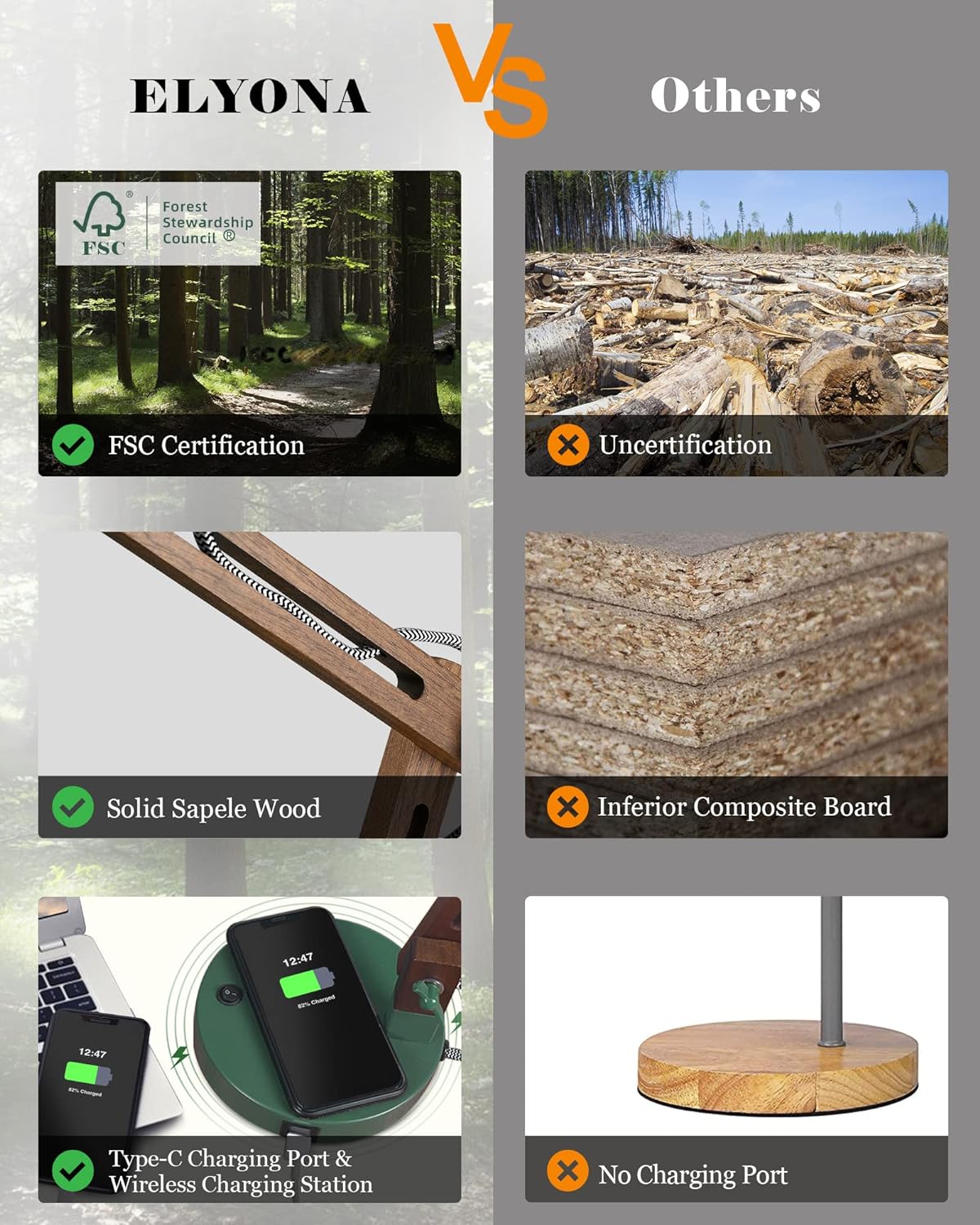 👍【 FSC Certified Sapele Wood 】①Unlike fiberboard’s wood grain paper surface and is glued with unknown woodchips inside. ELYONA desk lamp made of Sapele Wood produced in Congo pear. Free of glue, formaldehyde. Natural real wood create healthy living spaces for your family and pets. ②Premium Nylon Braided Cable means you’ll be enjoying the lamp for years. ③ELYONA’s wood has FSC Certification which represents that the timber used is following the strict environmental standards of FSC.