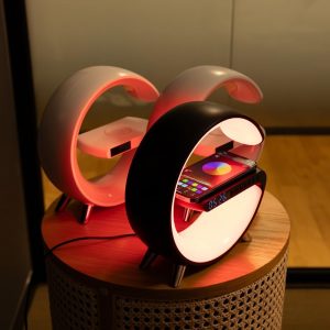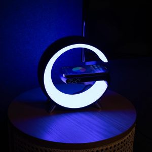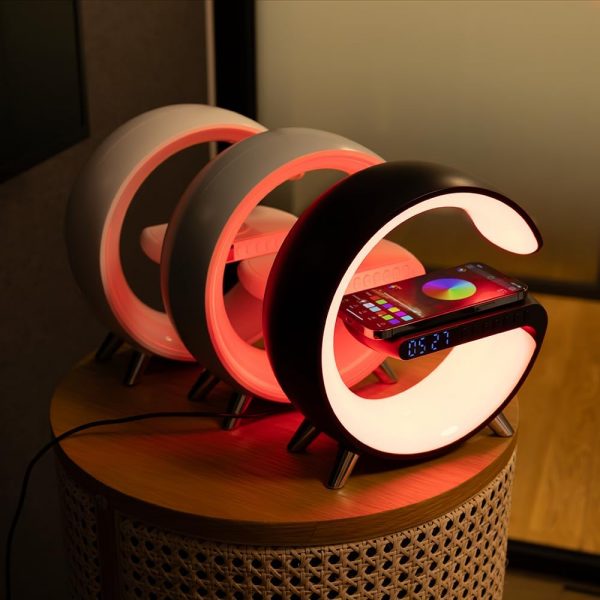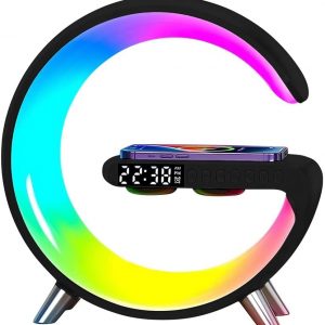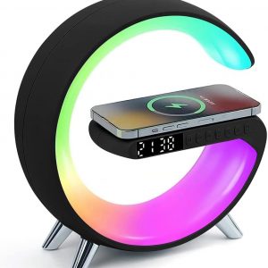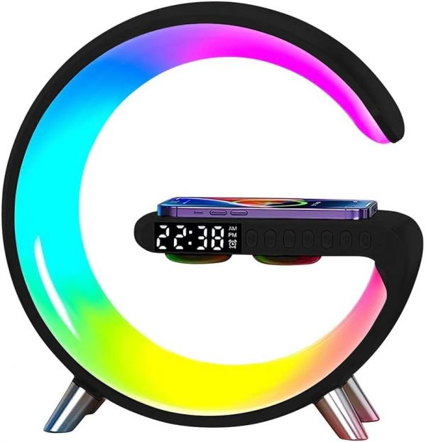 ETAMIBEL 4 in 1 Black Wireless Charger Night Light Lamp| Bluetooth Speaker Alarm Clock| 15W Fast Charging for iPhone Samsung Qi-Enabled Phones| Ambient Atmosphere Lighting for Bedside Doom Office