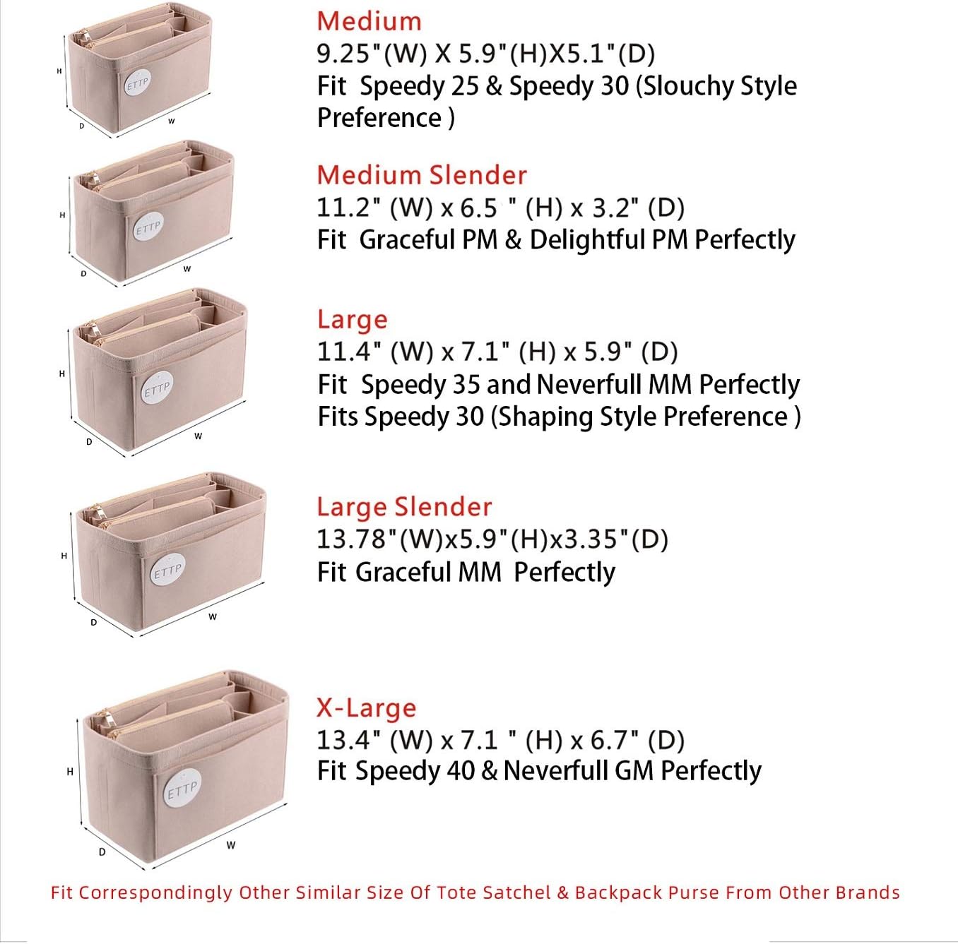 Large Size: 11.4(W)*7.1(H) *5.9(D)inch Fit Speedy 35 and Neverfull MM Perfectly and Fits Speedy 30 (Shaping Style Preference), Artsy MM & Book Tote Small & Le piage Shoulder Bag L/ Top Handle M,BK35, St PM and Marc Jacobs Tote Small.