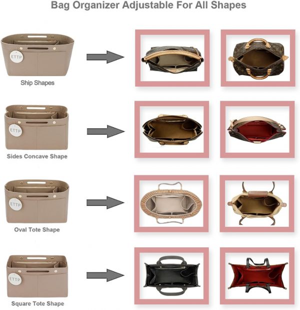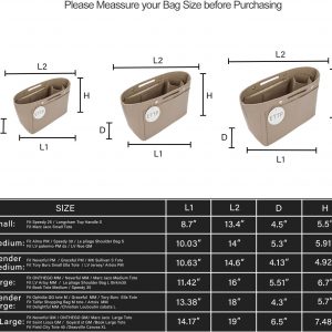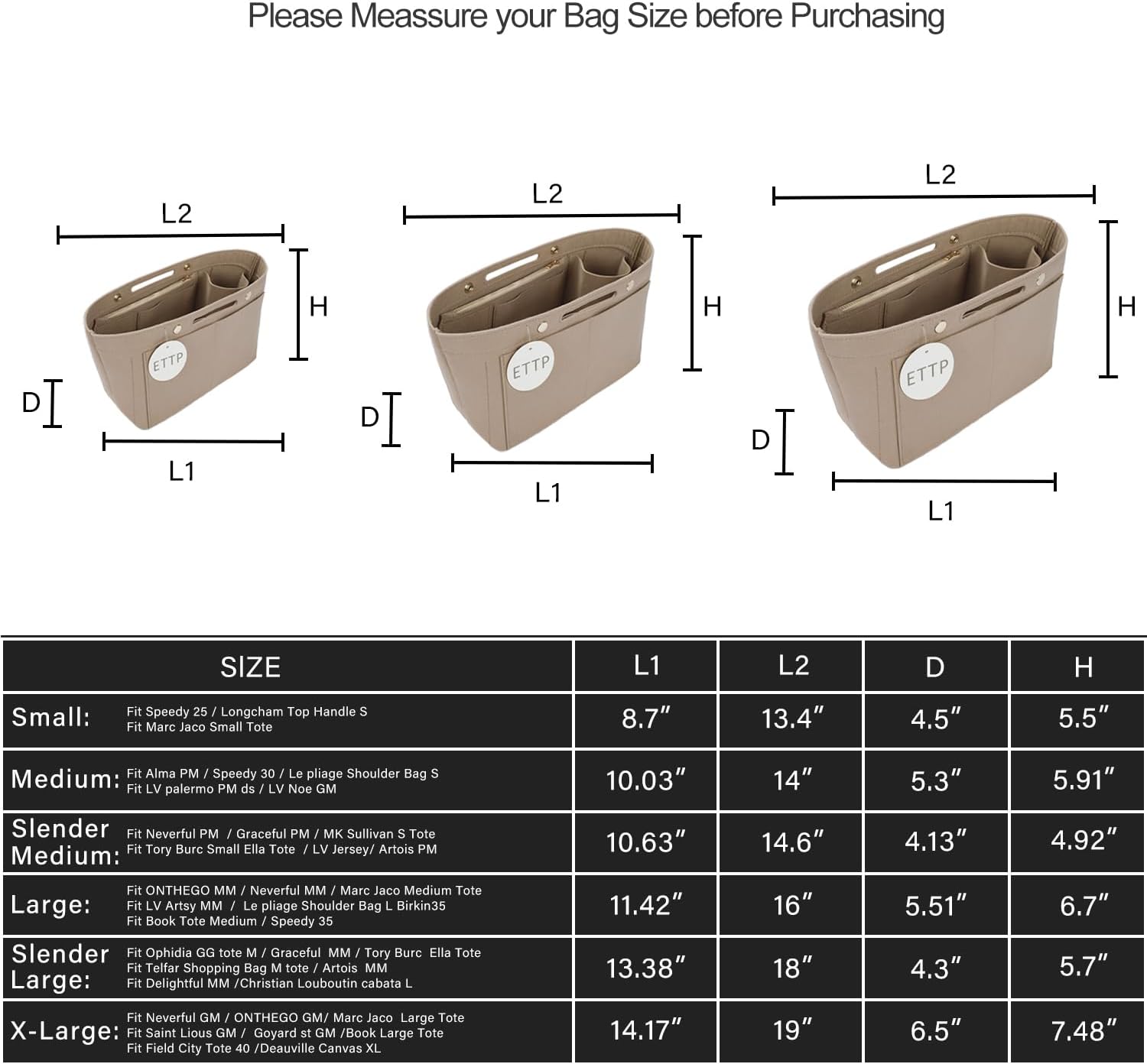 ✨Large Tote Bag Organizer:11.42″ (W) x 6.7″ (H) x 5.51″ (D) fits ONTHEGO MM ,Neverful MM and M*rc J*cobs Medium Tote, BOOKING TOTE MEDIUM and Speedy 35 ✨Slender Purse Organizer Insert For Handbags:13.38″ (W) x 5.7.” (H) x 4.3″ (D) fits Graceful MM, Delighting full MM and Ophidia GG Tote M ✨X-Large Tote Organizer Insert:14.17″ (W) x 7.48.” (H) x 6.5″ (D) fits M*rc J*cobs Tote Large, Neverful GM and Onthego GM Perfectly. 💗Note: W*H*D refers to Length*Height*Width.[❤Premium Quality Felt Fabric]: Purse Organizer Insert For Handbags with High quality and New Materials are made of Sturdy ,Soft and pliable, Lightweight Felt fabric.It protects your items inside handbag 4 COLORS & of Tote Bag Organizer Insert are availables: Beige,Black, Red and Brown.[❤WARRANTY AND OTHER ITERMS]: All of Purse Organizer from ETTP. With 1 Year Hassle-free Warranty. Contact Us If Anything Comes Up And We Will Do Our Best To Get It Done In 24 Hours. We Guarantee 100% Satisfaction After-sale Service For ETTP Purse Organizer Insert For Handbags