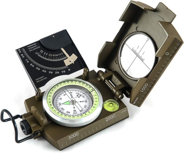 You’ll be all set for some great adventures with this lightweight compass that provides reliable and accurate directional performance. This is a heavy-duty military compass suitable for practically any situation. There are a variety of features including a thumb hold, magnifying viewer and a sighting window with a reticle.
