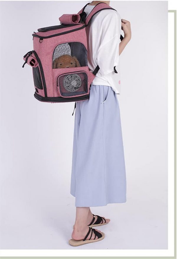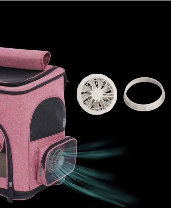 Fan Design: A small fan is built in the left mesh bag, which can work by connecting the mobile power supply. (Please note that our pet carrier does not include mobile power supply, please bring it by yourself)