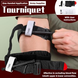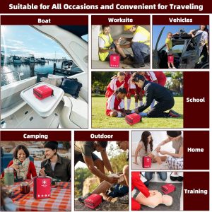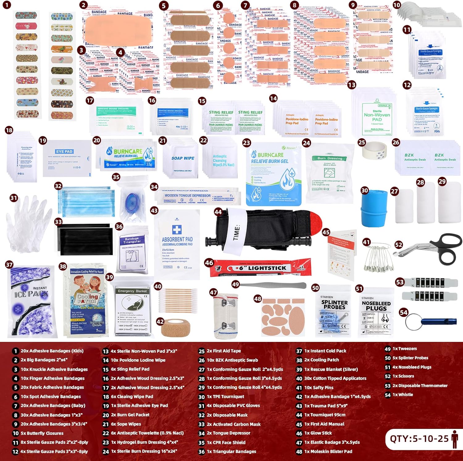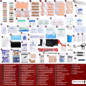 ADHESIVE BANDAGES 20x Adhesive Bandages 3″x3/4″, 20x Adhesive Bandages 3″x3/4″ (Fabric), 30x Adhesive Bandages 1″x3″, 10x Spot Adhesive Bandages, 2x Big Bandages 2″x4″, 10x Knuckle Adhesive Bandages, 10x Finger Adhesive Bandages, 20x Adhesive Bandages (Baby), 20x Adhesive Bandages (Kids), 5x Butterfly Closures CONFORMING GAUZE ROLL 1x Conforming Gauze Roll 2″x4.5yds, 1x Conforming Gauze Roll 3″x4.5yds, 1x Conforming Gauze Roll 4″x4.5yds STERILIZATION 8x Sterile Gauze Pads 2″x2″-8ply, 4x Sterile Gauze Pads 3″x3″-8ply, 2x Adhesive Woud Dressing 2.5″x3″, 2x Adhesive Woud Dressing 2.5″x4″, 1x Sterile Adhesive Eye Pad TRAMUA KIT 1x Tourniquet 95cm, 1x TPE Tourniquet, 1x Triangular Bandages, 1x Adhesive Bandage 1″x4.5yds, 1x Trauma Pad 5″x9″, 4x Sterile Non-Woven Pad 3″x3″,2x Adhesive Woud Dressing 2.5″x3″, 2x Adhesive Woud Dressing 2.5″x4″, 1x Rescue Blanket (Silver), 2x First Aid Tape, 4x Disposable PVC Gloves SPRAIN 1x Adhesive Bandage 1″x4.5yds, 1x Elastic Badage 3″x.5yds, 10x Safty Pins TOOLS 2x Tongue Depressor, 30x Cotton Tipped Applicators, 1x Tweezers, 1x Scissors, 5x Splinter Probes, OTHERS 1x CPR Face Shield, 1x First Aid Manual, 1x Moleskin Blister Pad, 4x Nosebleed Plugs, 1x Whistle
