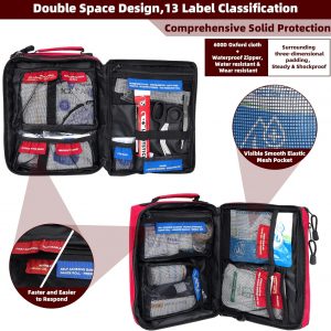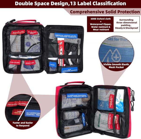 🏷️【SCIENTIFIC STORAGE】- The bag has 4 sections with 13 classification first-aid zone compartments. Each compartment shows what contents are inside. There are two zippered compartments and the rest are pouches with elastic strips at top to hold your supplies in more securely. The the inner compartments are made of see-thru mesh.