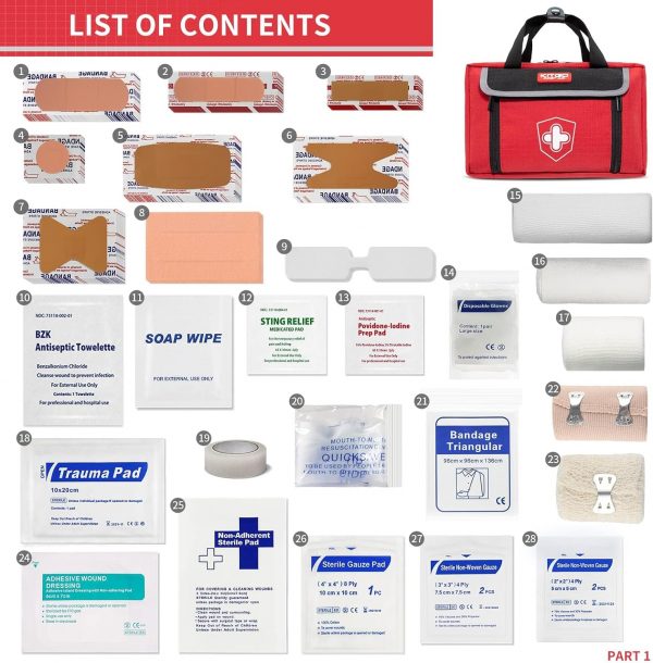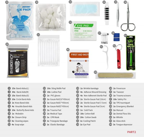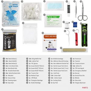 【Practical Survival Gears】Contains 218 pieces first aid kit gear-emergency blanket,band aids,pbt bandage,whistle,metal scissor,TPE tourniquet,cotton swab,tweezers,non-woven pads, triangular bandage etc.