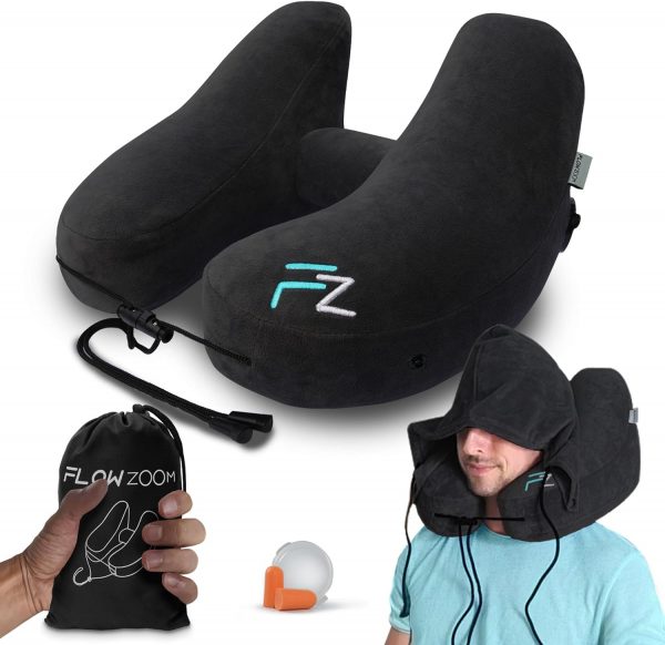 🌬️ Swift rest, easy pack – Discover our fast inflating travel neck pillows for airplanes! The travel set includes a neck pillow with hood, earplugs & a handy bag.