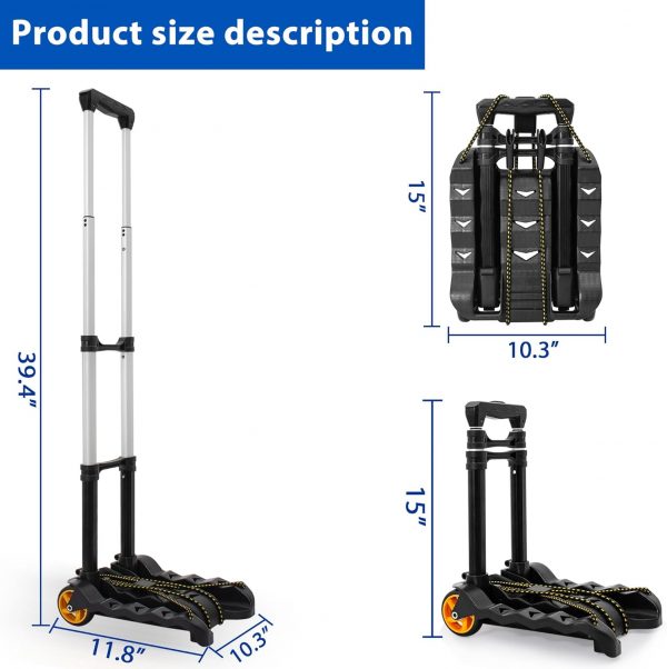 【Easy to Fold & Store】: Folded Dimensions: 15.6″ x 13″ x 3.5″. Expanded Dimensions: 12.6″ x 13″ x 38.3″, Weight 2.6 lbs. You can easily fold or unfold this folding trolley in seconds. When not in use, the luggage cart can be fully folded flat for easier transport and storage in any corner of the home, such as in the car, under the bed, in the closet or in the garage. Easy to store without taking up space, you can also put it in a backpack for easy carrying, perfect for moving or shopping.