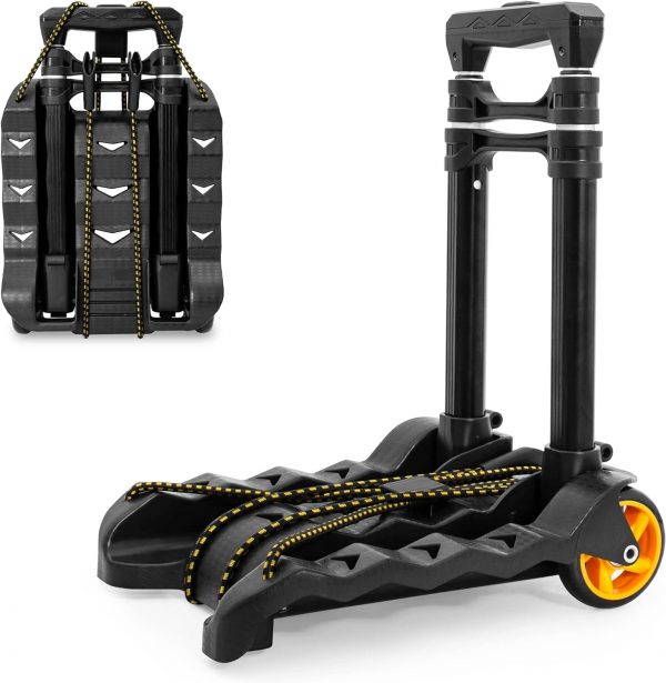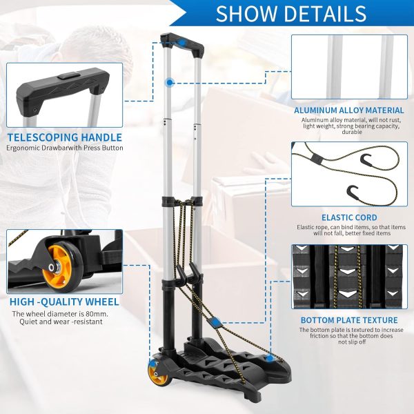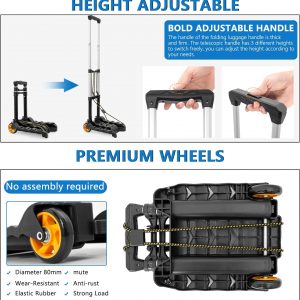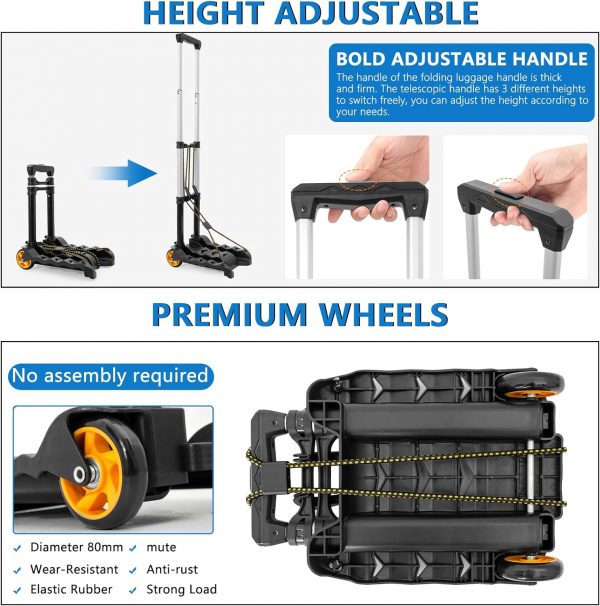 【High-quality Wheels】: Wheel diameter 80mm. Quiet and wear-resistant. The folding hand truck adopts upgraded wheels made of high-quality materials, which are more stable, more able to maintain balance, increase load capacity and stability, and are more wear-resistant, smooth and durable than other rubber wheels on the market.