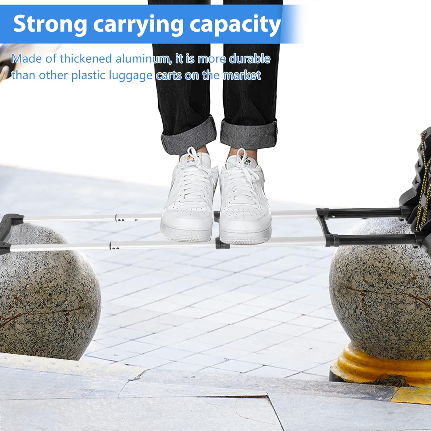 High quality tough aluminum alloy. Bold handle, safe and firm. Spring lock for smooth and fluent bounce. The telescopic handle has 2 different heights that can be switched freely, you can adjust the height according to your needs. The luggage cart comes with a bungee cord, no additional purchase required.