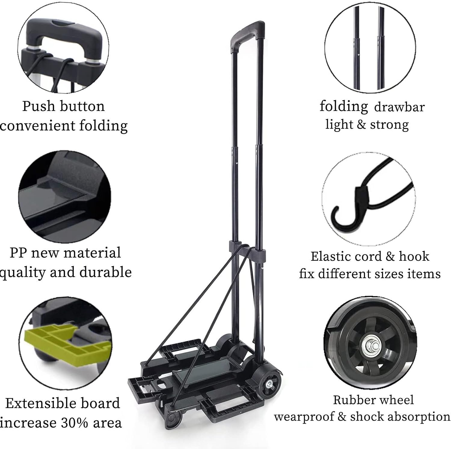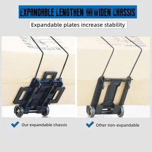 WIRJIJI 2-wheels folding hand truck,with expandable chassis, increases 30% area of the chassis and can increase stability when carrying luggages. It’s perfect for moving,shopping,travel,camping and office.Mini size for easy storageThe luggage cart with the compact size and light weight, you can put into your car trunk or even a backpack after folded and won’t feel heavy. High quality 2 noiseless wheelsUpgraded wheels are more durable,wear-resistant and noiseless.Strong & Sturdy construction The foldable dolly is made of thickened iron and high quality ABS in strong construction.Integrated molding technology is adopted to increase strength while ensuring lightness.