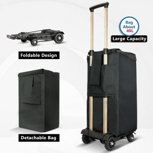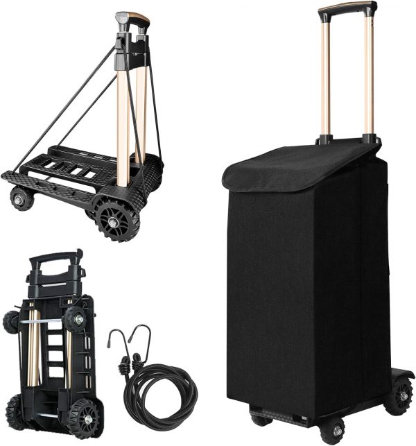 【Heavy Load&Large Capacity】This folding luggage cart use rust-proof aluminum alloy gold handle(stronger and lighter) with functional side hooks, offer extra place to hang items to free your hand, large base plate, can hold up to 155Lbs, a good helper to move package, large size boxes, after attaching the bag, this utility cart can hold up to 46L items like clothes, groceries, daily necessaries, the inner lining of the bag and drawstring at the opening will keep items protected.