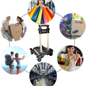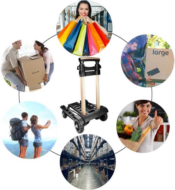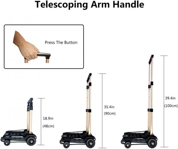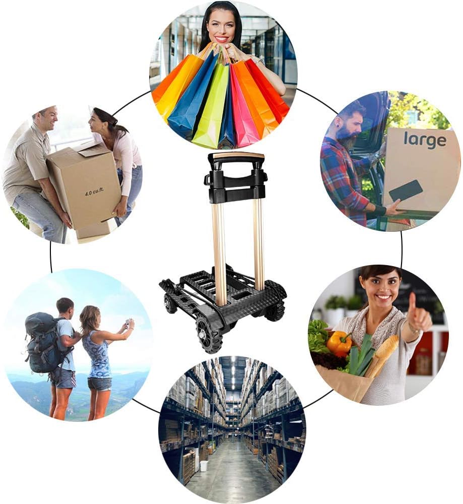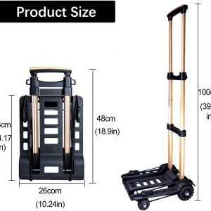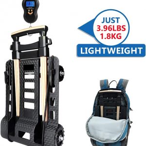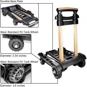 【Compact Folded Size& Easy Storage】This folding hand truck trolley can be easily folded into a small size(18.9×10.24×4.33inch) with light weight(3.96lbs), the 3-level telescoping handle(18.9-35.4-39.4inch) allow you to freely choose the suitable height to use it, save space design, foldable and portable, you can store it in anywhere you want-under the bed, in the trunk of car, in the corner, carry it by hand or put it in your backpack in case anytime you need to use it.