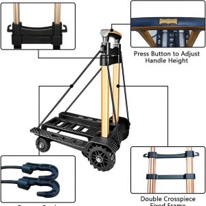 4 This durable folding hand truck trolley features a reinforced widened adjustable gold handle with ergonomic design,