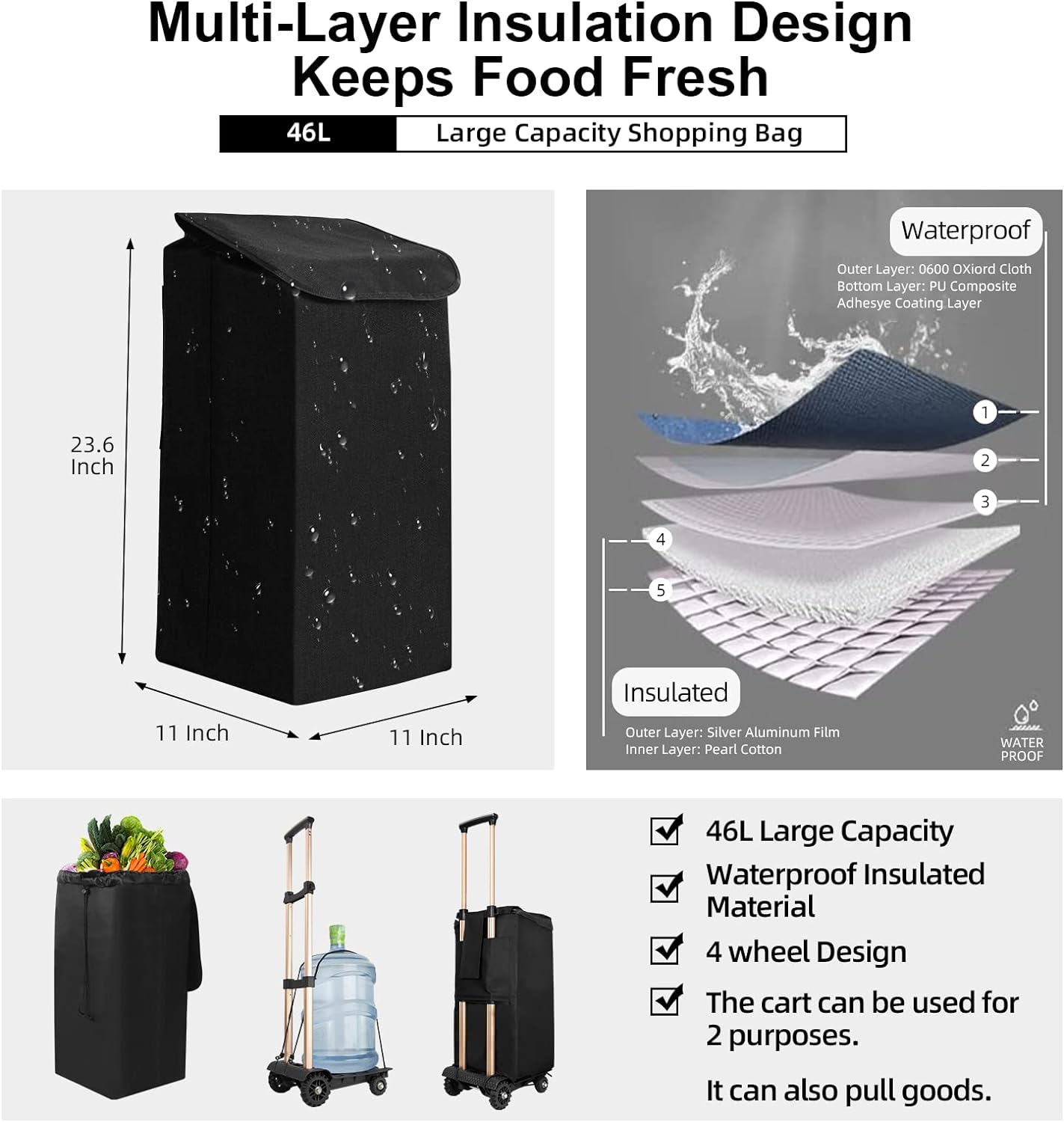 · Capacity: cart can load 70 kg (155 lbs), bags can hold 46L