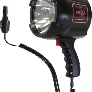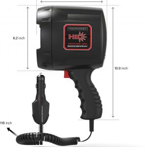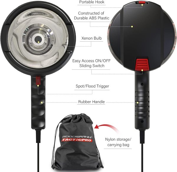 Thoughtfully Designed Accessories – Equipped with a convenient pothook at the top and a 12V DC adapter at the bottom of the pistol-grip, this handheld light is all about practicality. Plus, we’ve included a durable nylon storage bag to keep your handheld light safe and ready for your next adventure.