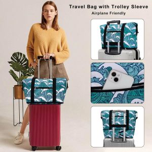 The Airplane Friendly Travel Tote Bag has a trolley sleeve that can be easily attached to your suitcase. This feature reduces the strain of carrying the bag during your journey, providing added convenience and making it easier to navigate through airports or train stations; Constructed from durable and water repellent materials, this bag is easy to carry and clean; The bag is the right size to fit on the luggage rack or under the seat;It is perfect as a holiday vacation travel bag, weekend bag, overnight bag, boarding bag, gym sports bag, beach bag and it’s also good as a mommy diaper bag, hospital bag for labor and delivery.