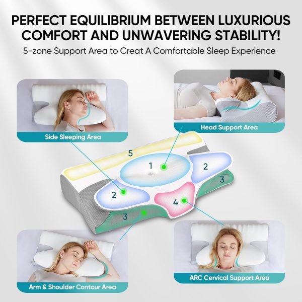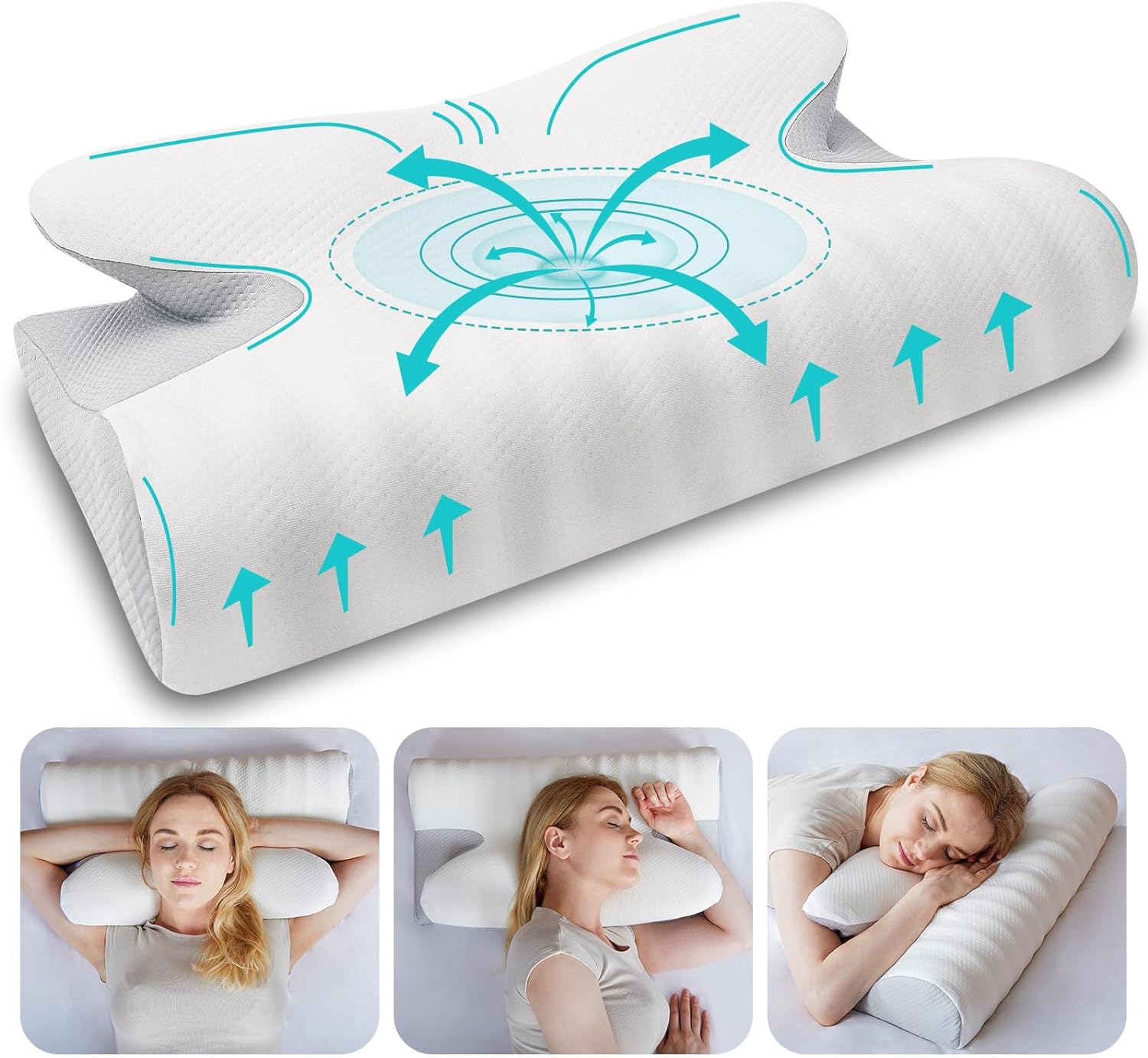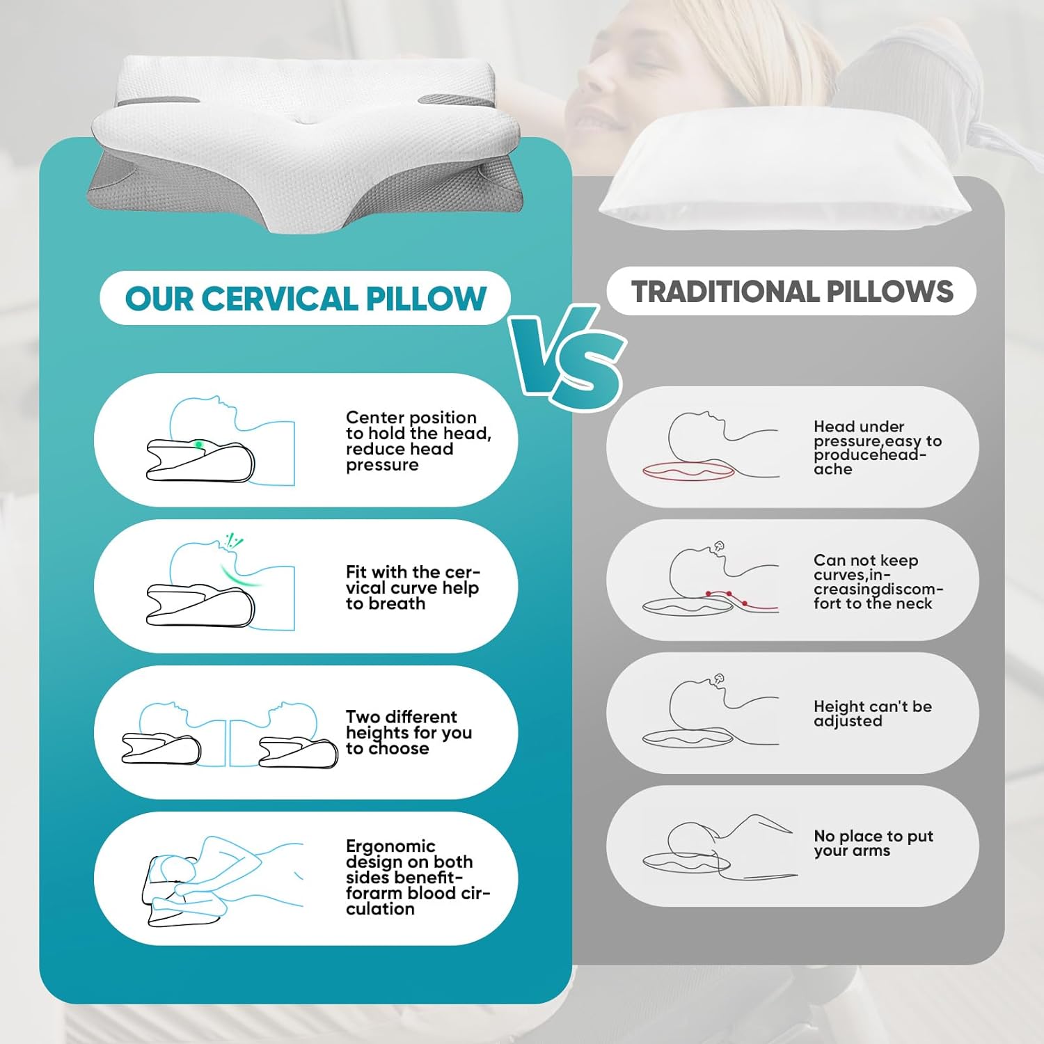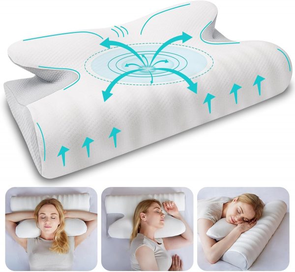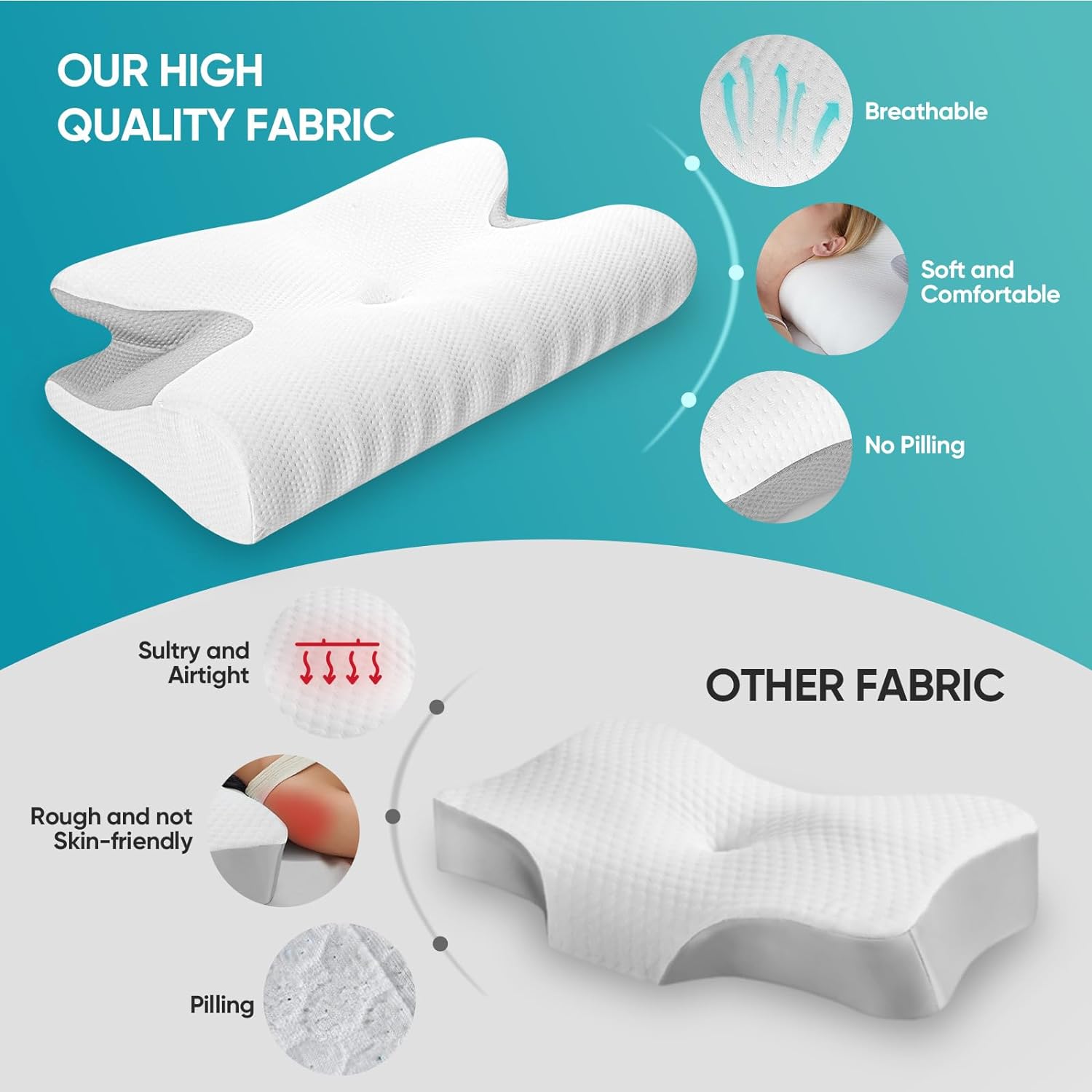 【Innovative Design】The cervical pillow we offer, commonly referred to as a neck pillow,is meticulously crafted to target and alleviate neck pain. Its ingenious center positioning design effectively diminishes pressure on the head while providing ample support. The ergonomically contoured shape of the pillow not only cradles the neck but also promotes optimal spine alignment and prevents any potential discomfort in the shoulders.
