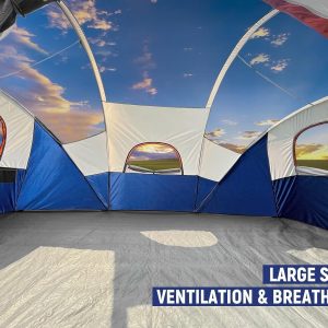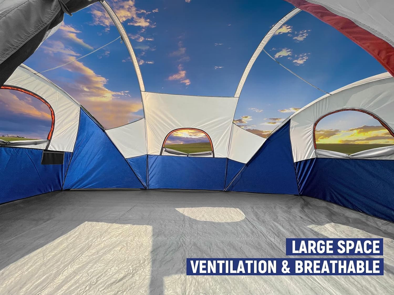 【LARGE SPACE VENTILATION & BREATHABLE】 To enhanced airflow, this camping tent has 1 large mesh door, 4 mesh windows & breathable top ceiling, which enables fresh air and a warm breeze to come in and out easily. Meanwhile, you could also enjoy the starry sky at night with your family members while lying in the tent.
