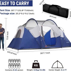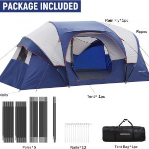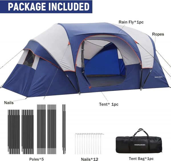 【SPACIOUS FOR 10 PERSON TENT】 HIKERGARDEN 10 person tent designed with the floor dimension of 168 x 132inch and the center height is 74inch, larger than normal tents ensure most people could stand straight up in the tent without stooping. Spacious enough for 10 adults, 3 Queen air mattresses or 10 sleeping bags are well fit inside. An ideal family tent for car camping or outdoor traveling at all weather.