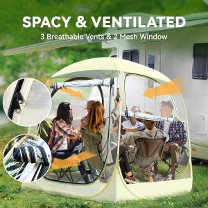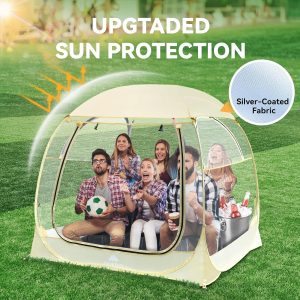 【Sun-Protective & Ventilation】The instant sports tent with silver-coated fabric gives you extra sun protection to help keep temperatures cool in summer. Three air vents on the side windows are PVC and mesh to provide good ventilation in hot weather and prevent mosquitoes.