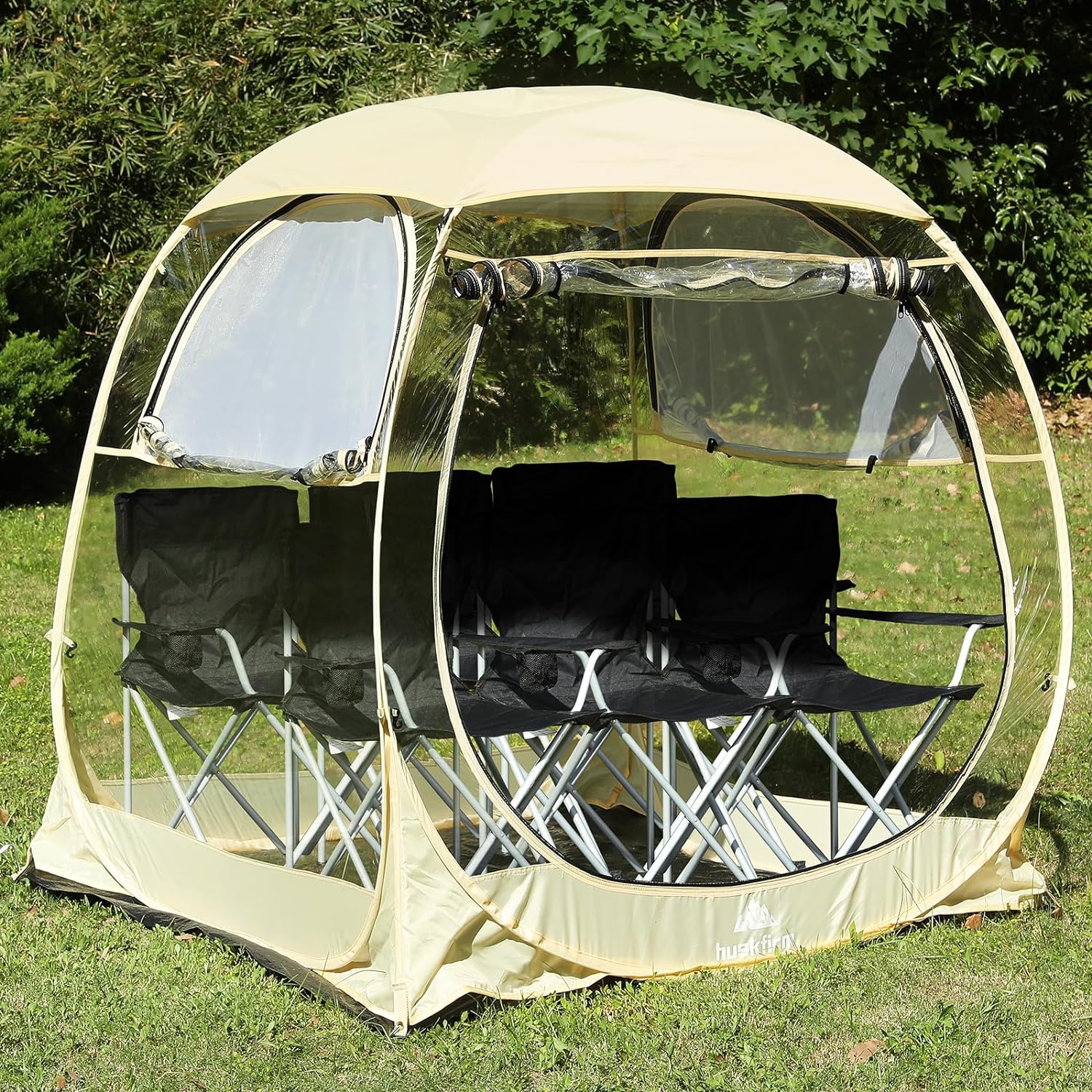 【Sun-Protective and Sturdy】The weather pod with silver-coated fabric gives you extra sun protection to help keep temperatures cool in summer, while the outdoor clear tent is made with a sturdy fiberglass frame and durable fabric to protect you from snow and rain in winter.
