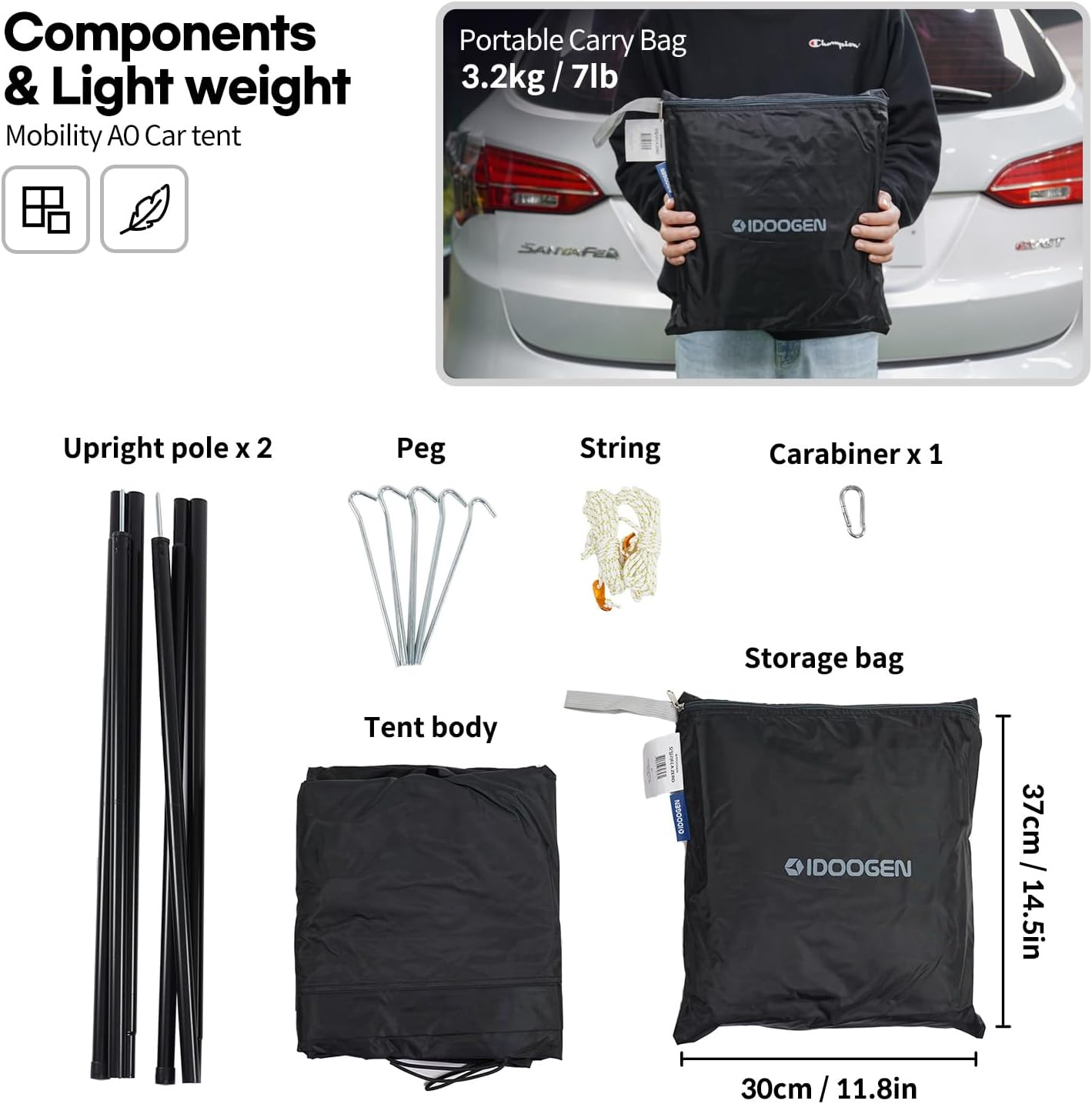 ☔【𝙐𝙑 𝘽𝙡𝙤𝙘𝙠 𝙖𝙣𝙙 𝙒𝙖𝙩𝙚𝙧 𝙍𝙚𝙨𝙞𝙨𝙩𝙖𝙣𝙩】The IDOOGEN SUV tailgate tent is made of 210D polyester oxford and features a PU1000 coating, making it a reliable shelter for outdoor camping, rain or shine.2 steel poles ensure that the Shelter works perfectly even in high winds. High-density mesh, which not only keeps mosquitoes out, but also ensures ventilation and privacy.