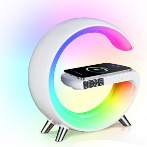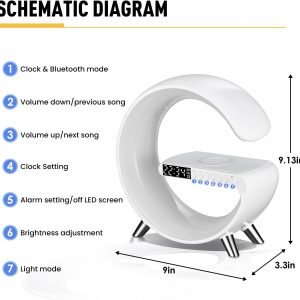 【4 in 1 Multifunctional Wireless Charging Atmosphere Light】: Newly upgraded G-shaped design. The lamp is not only an atmosphere light, Bluetooth speaker, music, sleep light, atmosphere light, bedside light, glare effect, Bluetooth audio, clock, alarm clock and other functions. You can use this great light while working, studying, reading and sleeping.