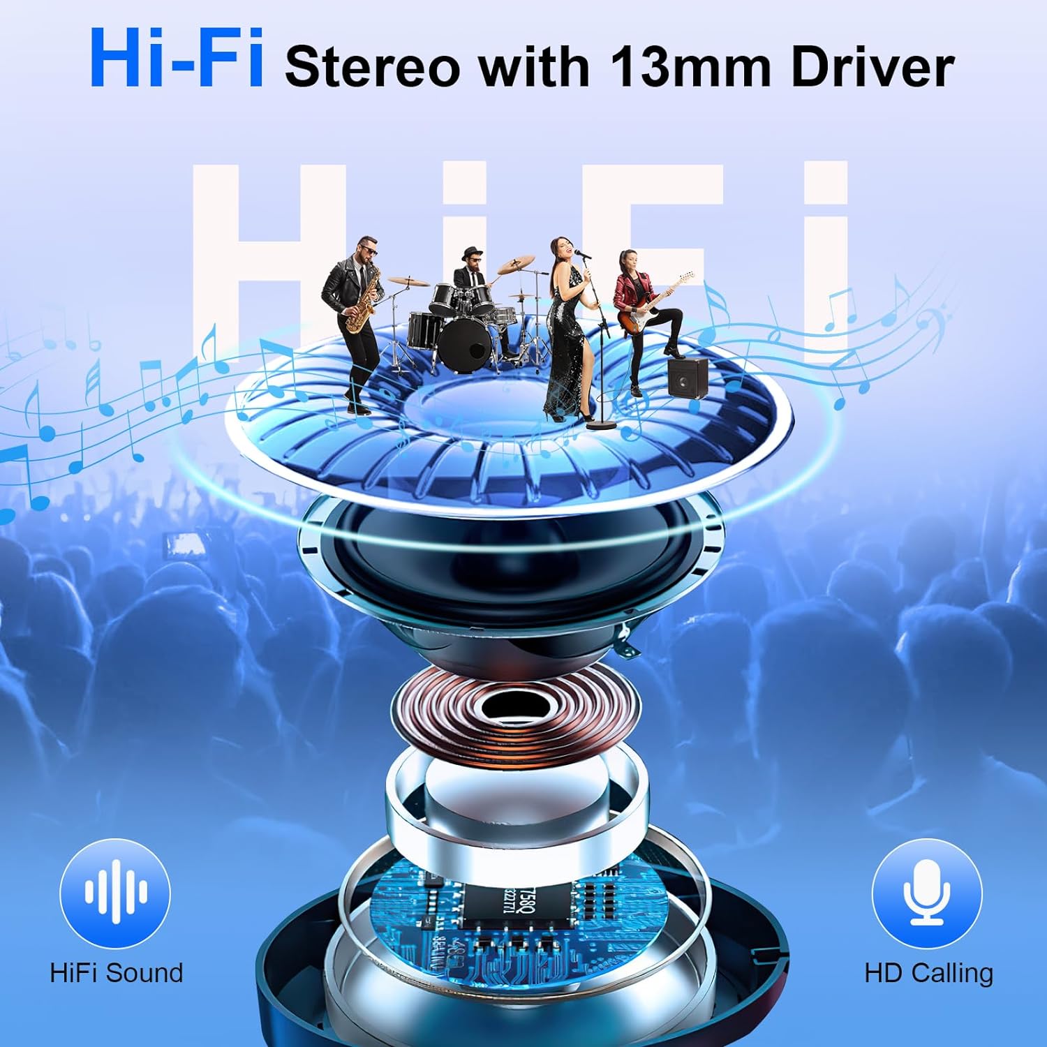 【Hi-Fi Stereo Sound & Crystal Clear Calls】The wireless earphones features a 13mm titanium diaphragm speaker driver, keeping high quality stereo sound with rich deep bass and crystal clear treble. The earphones are designed to accurately capture your voice and reduce background noise while in real-time calls, video chats, online meetings and so on.