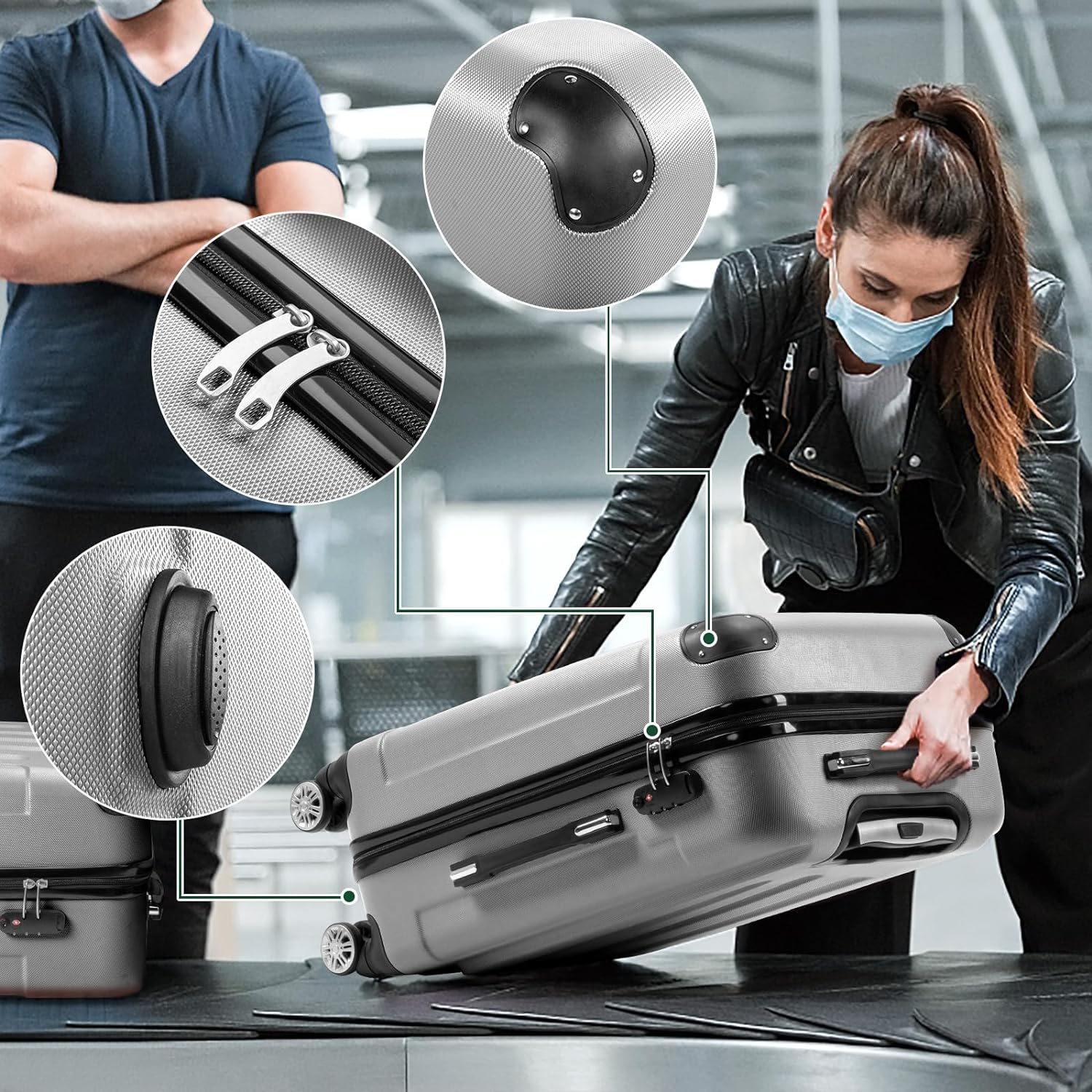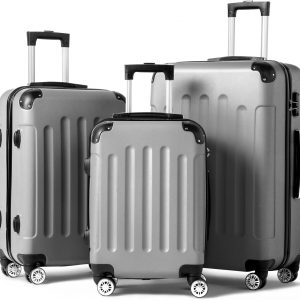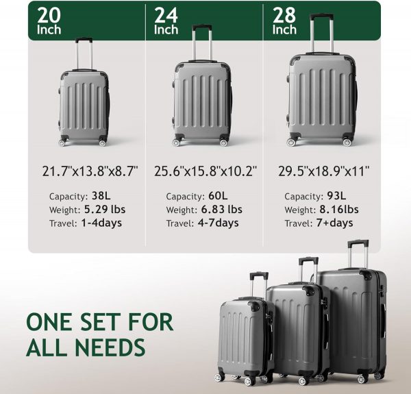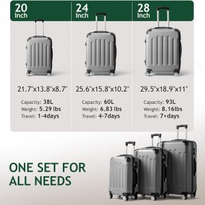 Material: ABSCaster Diameter: 1.97″20 inch : 21.7″ x 13.8″ x 8.7″, 38L, 5.29lbs, for 1-4 days travel24 inch : 25.6″ x 15.8″ x 10.2″, 60L, 6.83lbs, for 4-7 days travel28 inch : 29.5″ x 18.9″ x 11″ , 93L, 8.16lbs, for 7+ days travel