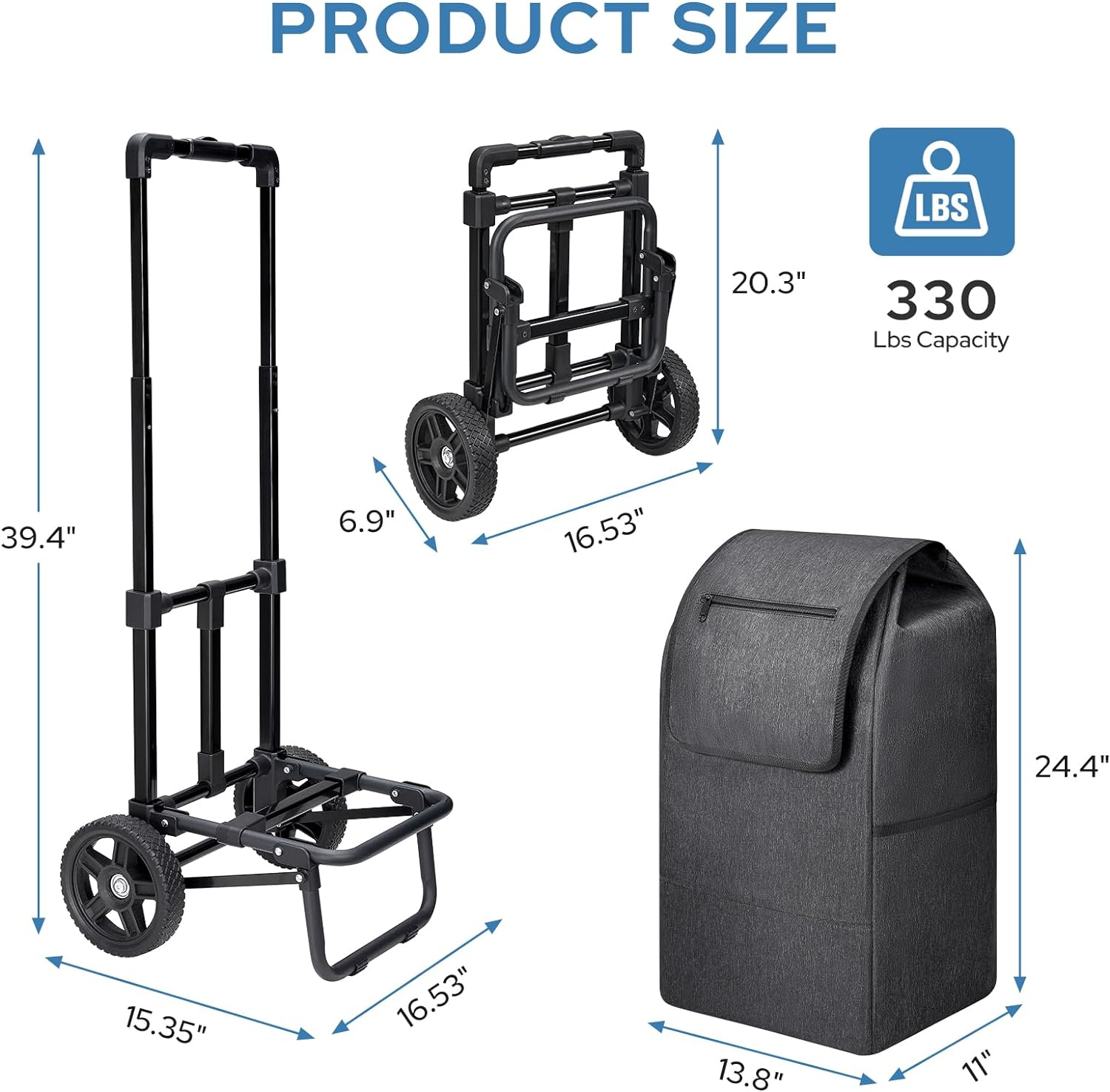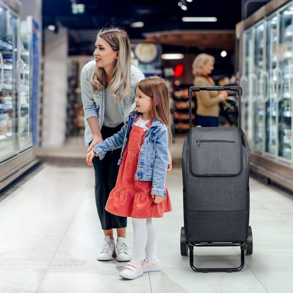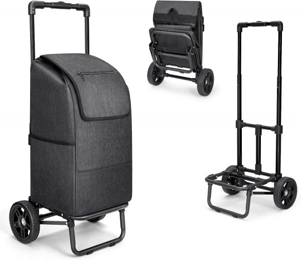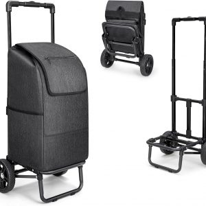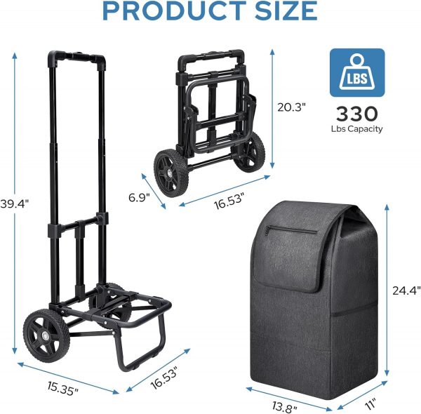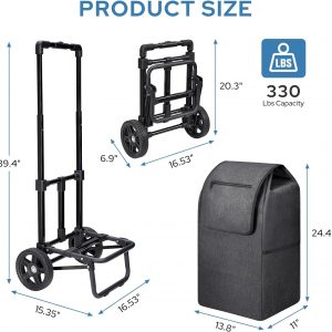 【Portability and Compact Storage】The foldable feature of the hand truck and the removable black bag enhance portability and enable compact storage. The foldable shopping cart is convenient for carrying or easy storage in a car’s trunk, under a bed, in a closet, in storage rooms, or in garages, making it an ideal choice for both grocery shopping and other hauling tasks.