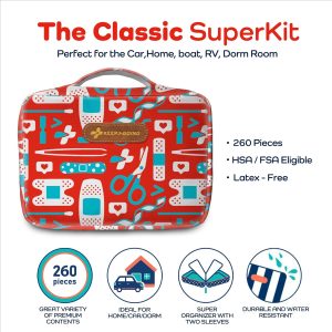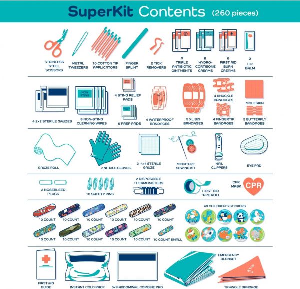 All You Need – Good things come in complete packages! Your large first aid kit has 260 pieces of essential first aid supplies for every ouchie. From burn relief to bandages, you’ll be ready for anything.