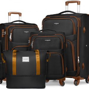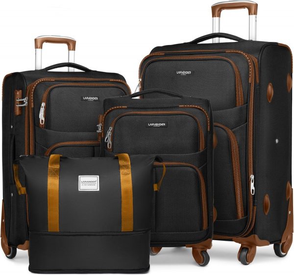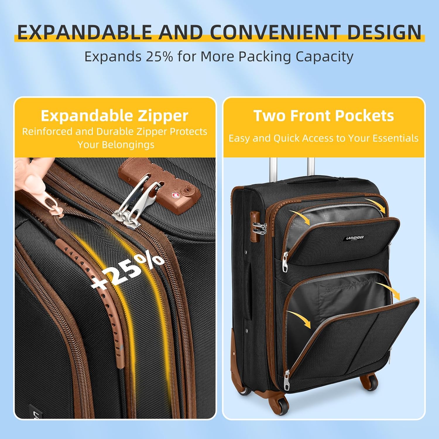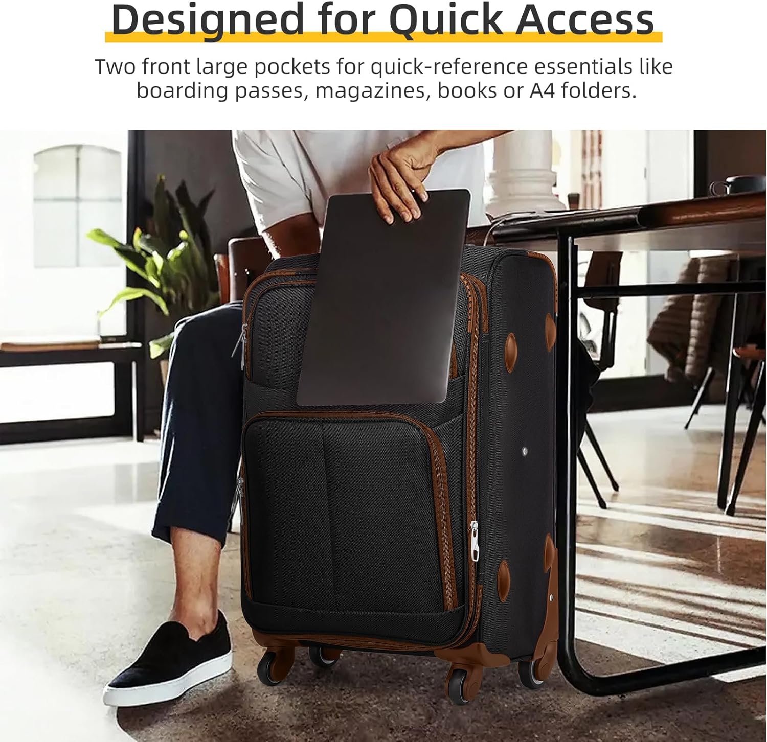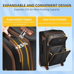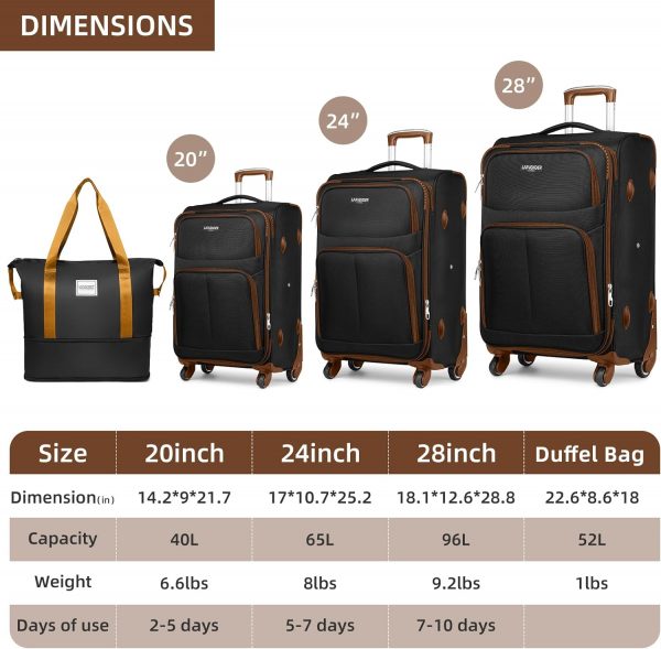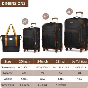 【EXPANDABLE SOFTSIDE LUGGAGE SETS】Four piece luggage in one set with 20 inch,24 inch,28 inch upright and a travel duffel bag, can be easily stored one into another for convenience. The 24/28″ suitcases and duffel bag are expandable, offering an additional 25% of space to maximize your packing capacity.