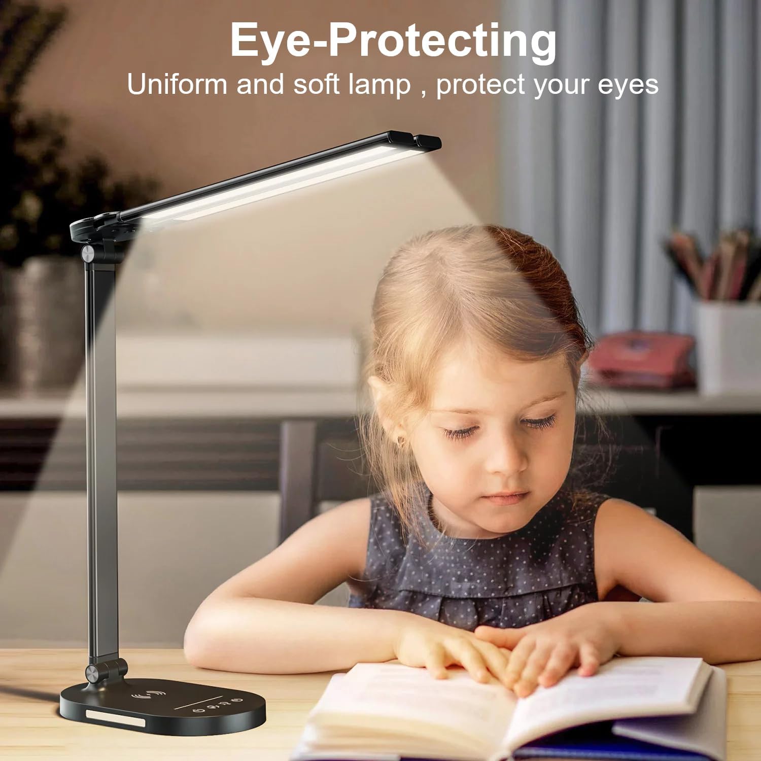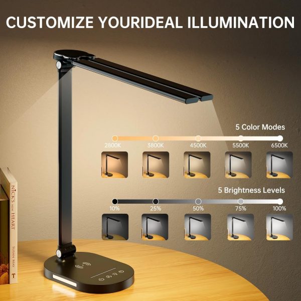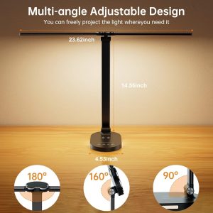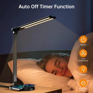 5 Color Temperatures 5 Brightness Levels Eye-Caring Light Wireless Charger & USB Charging Port Touch Control Height & Multi-angle Adjustment 60 Minute Timer & Memory Function Night Light