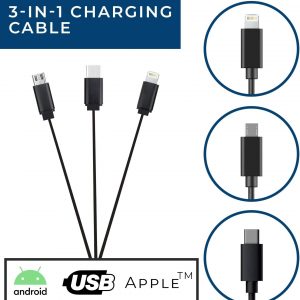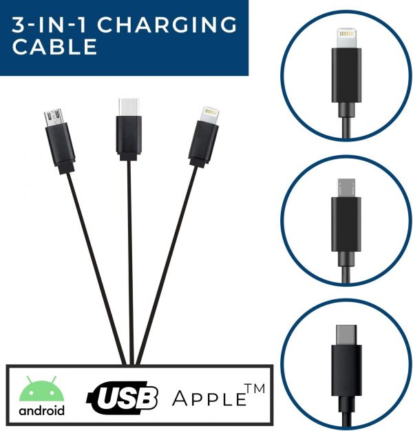 USB Port and included 3-in-1 cable charges iPhones, Androids, Tablets, etc.