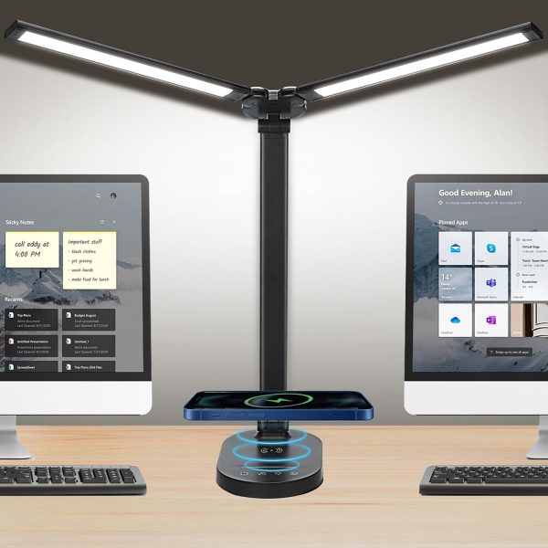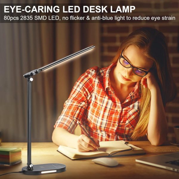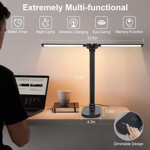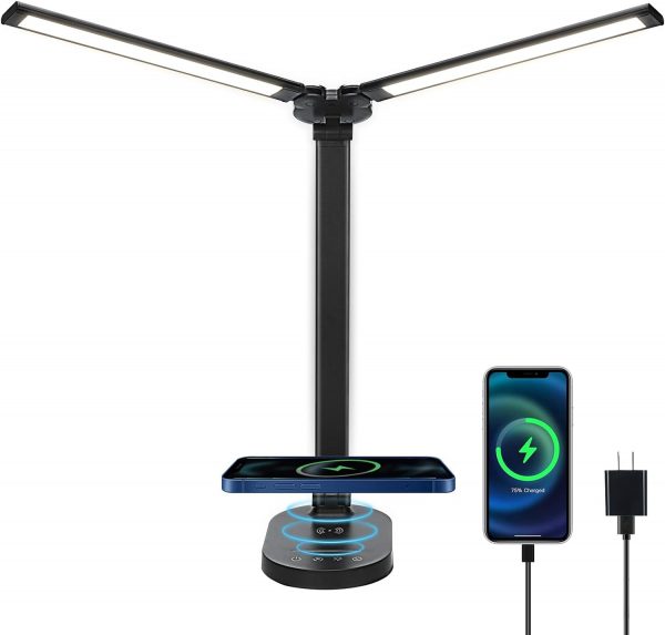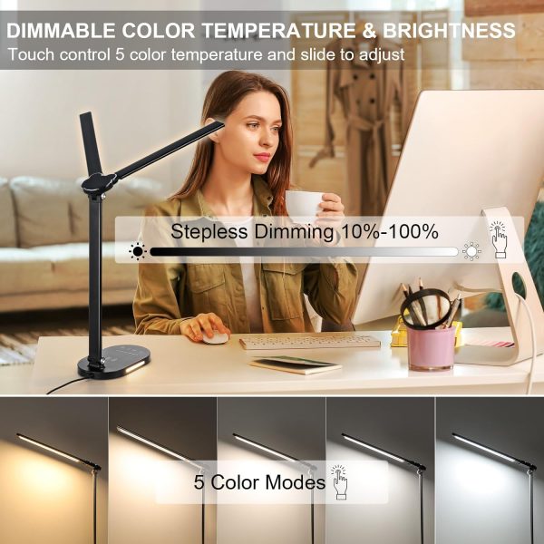 Lightess Double Swing Arm Bright LED Desk Lamp for Home Office – with Wireless Charger & USB Charging Port, 5 Color Modes & 5 Brightness Level, Touch/Memory/Timer Function, Sliding Dimmable Eye-Caring Office Lamp Desk Light for Study Reading, Foldable Table Lamp with Night Light, 14W, Black