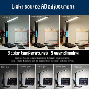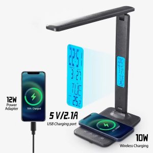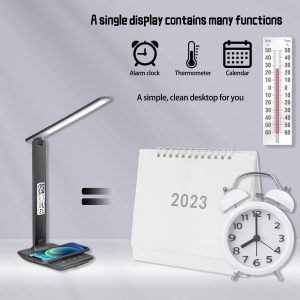 10W wireless charger, supporting wireless charging of mobile phones.USB charging port output can quickly charge devices such as mobile phones.The intelligent LCD screen displays the clock, alarm clock, calendar, week, and temperature.Folding design, lighting angle can meet various environmental lighting needs.Multifunctional lighting mode, 5 levels of brightness control and 3 color temperature adjustments (warm light, neutral light, cold light)