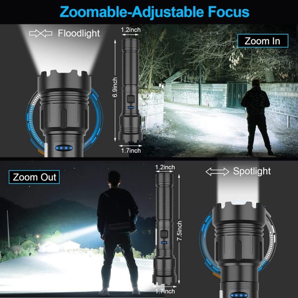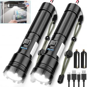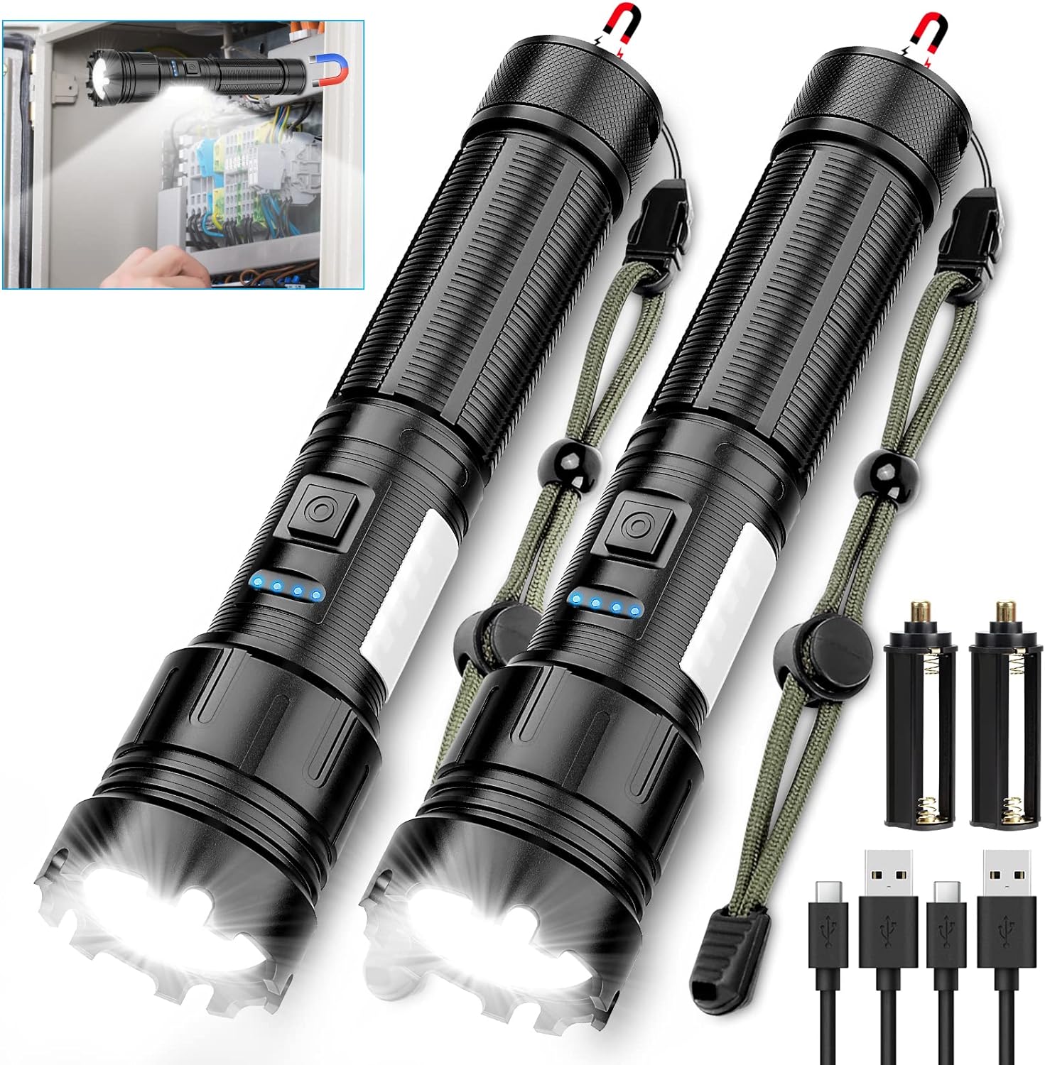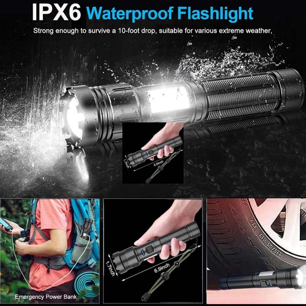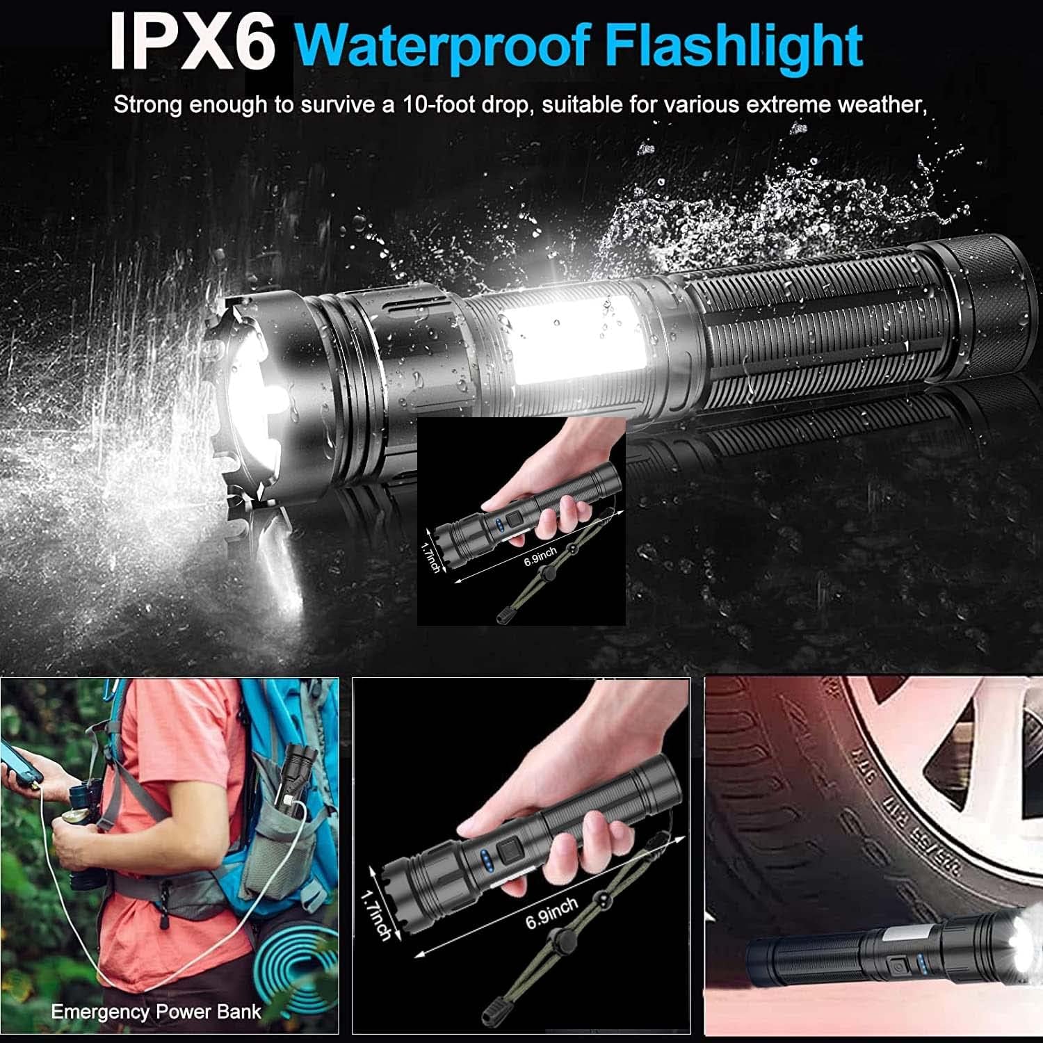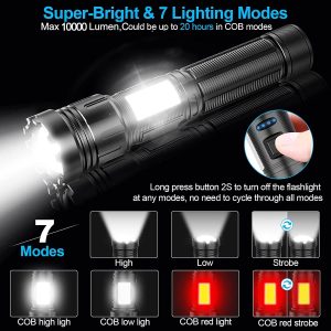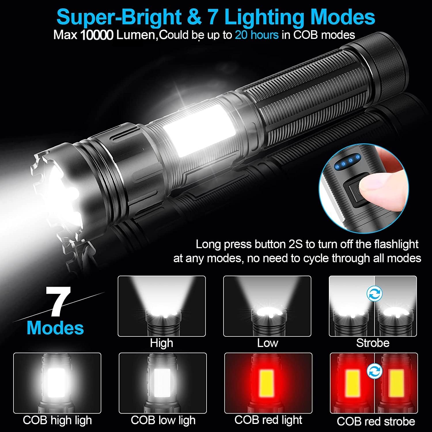 Super Bright Flashlights high Lumens, Long Lasting : Rechargeable flashlights eqipped with XHP50.2 LED(20,000+ hours of LED life span) delivery high powered 10000 Lumens lighting up an entire football field, with COB sidelight for large area of irradiation options, This high lumen flashlight can be run up to 20hours in COB modes(Real Test).