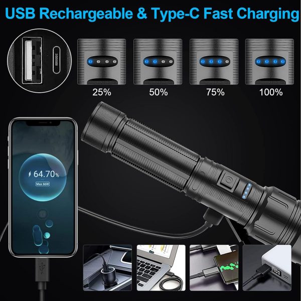 Rechargeable LED Flashlight, Fast charging&Power Bank: Rechargeable Flashlight build-in Type C usb charging port for 2hours fast charging, with Type C USB cable, this usb flashlight can be charged with any USB port, with USB Output port and 5000 m-a-h Ba-tt-er-y included, this high powered flashlight can be act as emergency power bank to charge your camera, phone, notebook and other devices during the trip.